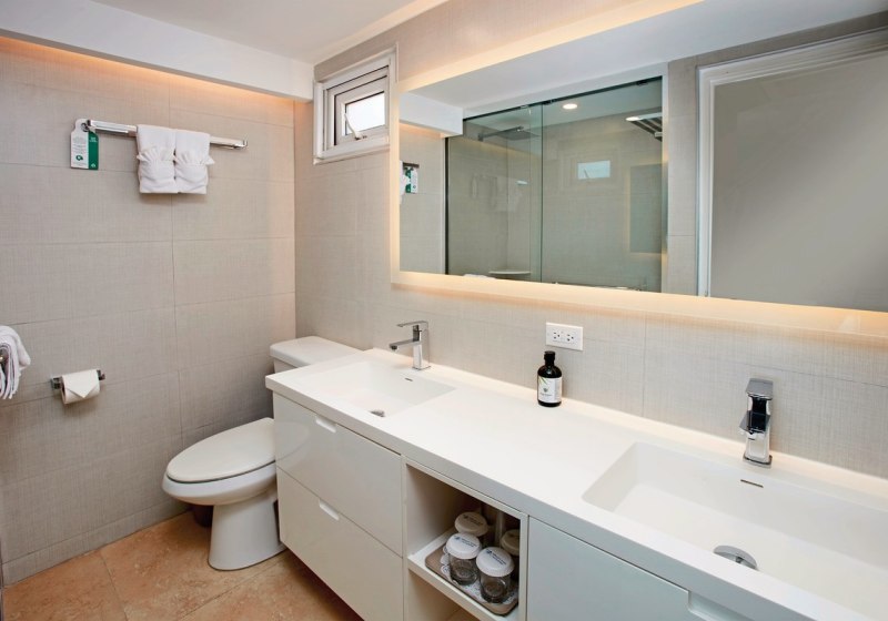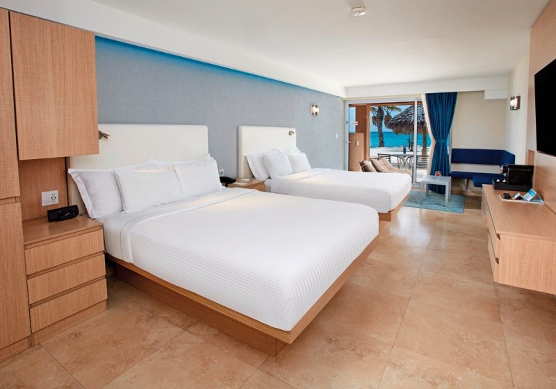 Zur Wahl stehen Kingsize-Betten oder zwei Queensize-Betten; manche Zimmer bieten zusätzlich ein Sofabett. Ein Steamer zum Dampfglätten gehört in allen Zimmertypen dazu, praktisch für leichte Kleidung. Größen liegen etwa zwischen 26 und 35 Quadratmetern, mit Sitzecke und/oder Schreibtisch für strukturierte Tagesplanung. Das Ergebnis wirkt klar, funktional und strandtauglich. Highlight: Alle Zimmer mit Meerblick und möbliertem Außenbereich.