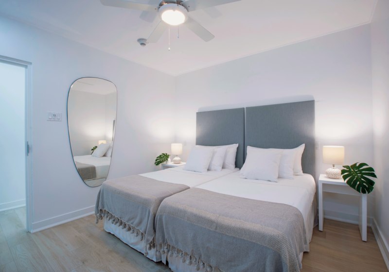 Ihr bezieht Appartements mit ein bis drei Schlafzimmern – ideal, wenn Ihr Platz, Rückzugsräume und eine klare Struktur schätzt. Klimaanlage und Ventilator, mehrere TVs sowie Sitzbereiche sorgen für Komfort. Der möblierte Balkon oder die Terrasse öffnet den Blick in Garten oder auf den Pool.