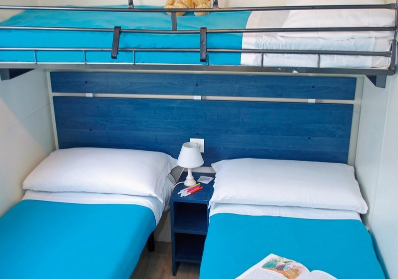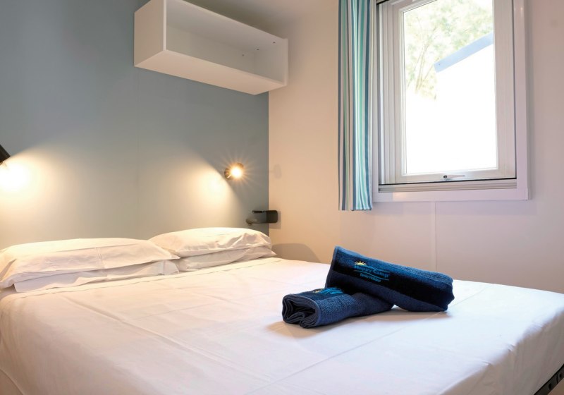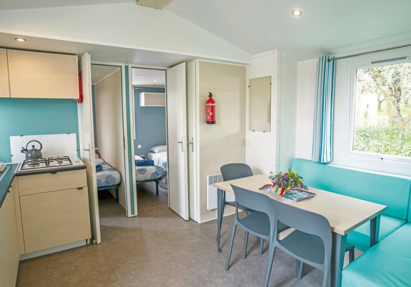Ihr wohnt in Mobilheimen mit zwei oder drei separaten Schlafzimmern – ein klarer Vorteil für Familien und Freundeskreise. Der kombinierte Wohn- und Schlafraum schafft Platz für gemeinsame Zeit, während die Kochnische mit Essecke einfache Selbstversorgung ermöglicht. Die Klimaanlage unterstützt konstante Temperaturen, Dusche und WC sind funktional integriert.