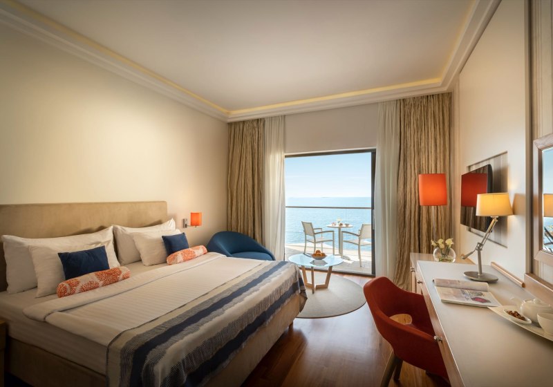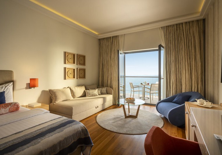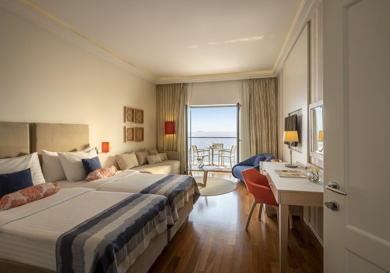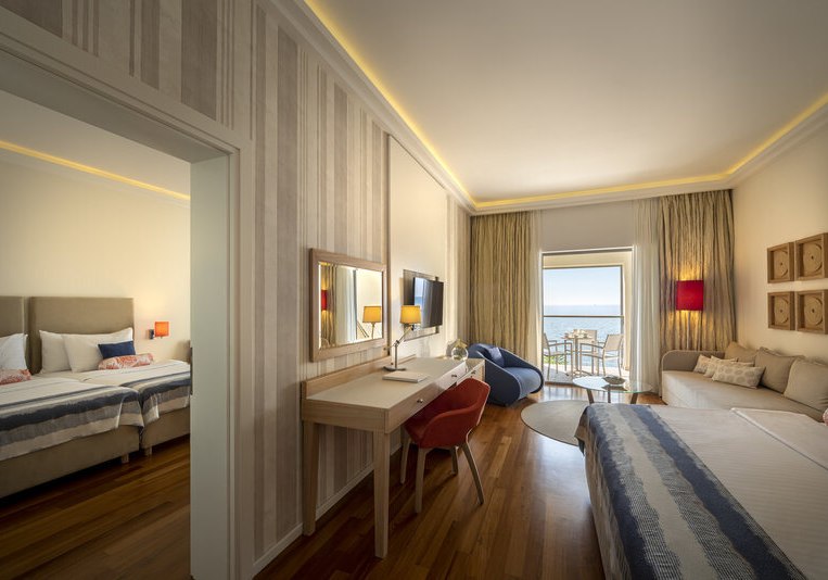 Weitere Ausstattungsdetails wie Kaffee-/Teezubereiter, Kühlschrank oder Schlafsofa sind je nach Kategorie verfügbar. Familien finden großzügige Optionen, Meerblick-Varianten betonen die Insellage. Badezimmer sind mit Dusche oder Wanne ausgestattet, Föhn inklusive. Ausgewählte Kategorien bieten Teppich- oder Fliesenboden und teilweise zusätzliche Betten. Highlight: Familienfreundliche Optionen und Meerblick-Varianten setzen stimmige Akzente.