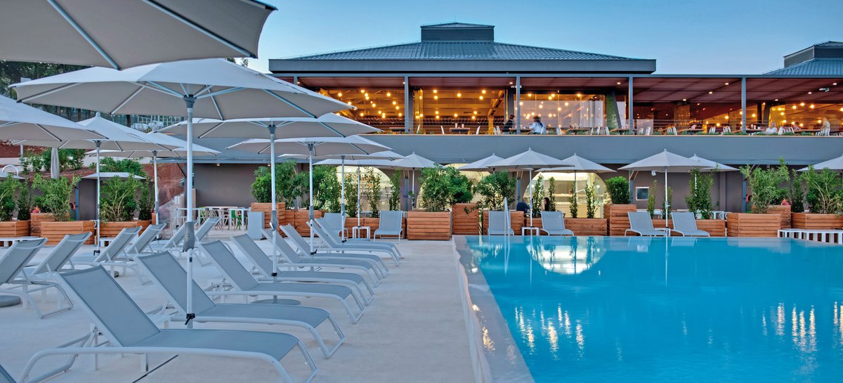 - Pool-Duo: Zwei Salzwasserpools plus Kinderbereich mit Liegen und Schirmen.