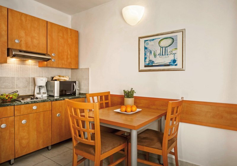 Ihr wohnt in Studios mit 21 bis 25 Quadratmetern, sinnvoll aufgeteilt in einen kombinierten Wohn- und Schlafbereich. Je nach Typ erwarten Euch ein französisches Bett und ein Sofabett. Die Ausstattung ist praxisorientiert: Dusche, Haartrockner, Klimaanlage, Safe und Sat-TV. Eine Kochnische mit Mikrowelle und Kaffeemaschine ermöglicht einfache Snacks und Heißgetränke.
