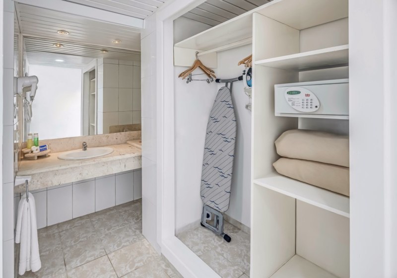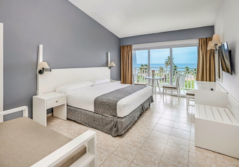 Die Zimmer sind großzügig angelegt; Standardkategorien bewegen sich bei etwa 41–45 Quadratmetern. Balkon oder Terrasse öffnen den Raum nach außen, auf Wunsch mit Meerblick oder Gartenblick. Fliesenböden, Sat-TV mit internationalen Sendern, Schreibtisch und Verdunkelungsvorhänge schaffen Alltagstauglichkeit. Safe, Minibar, Mineralwasser und ein Bügelset ergänzen die Grundausstattung.