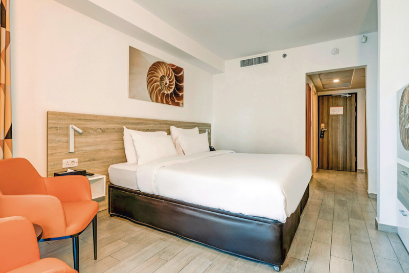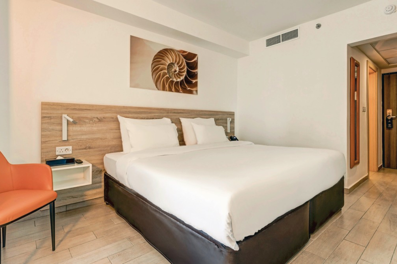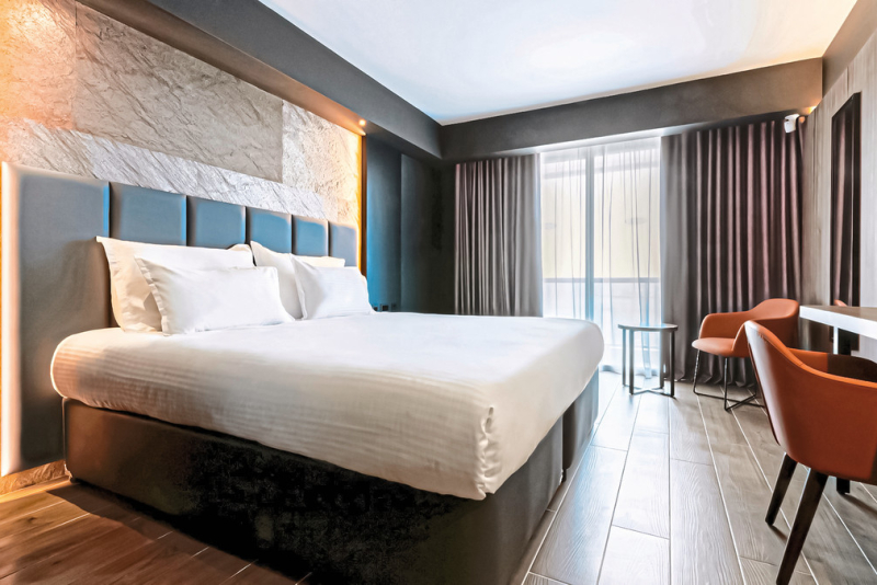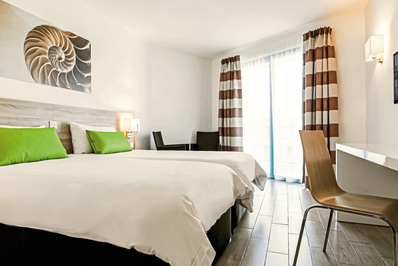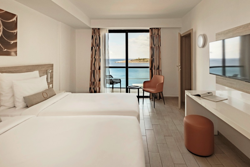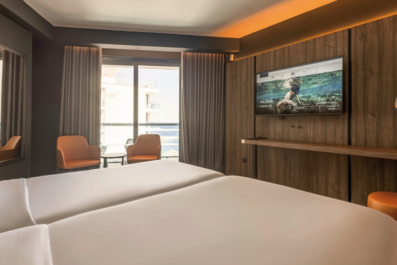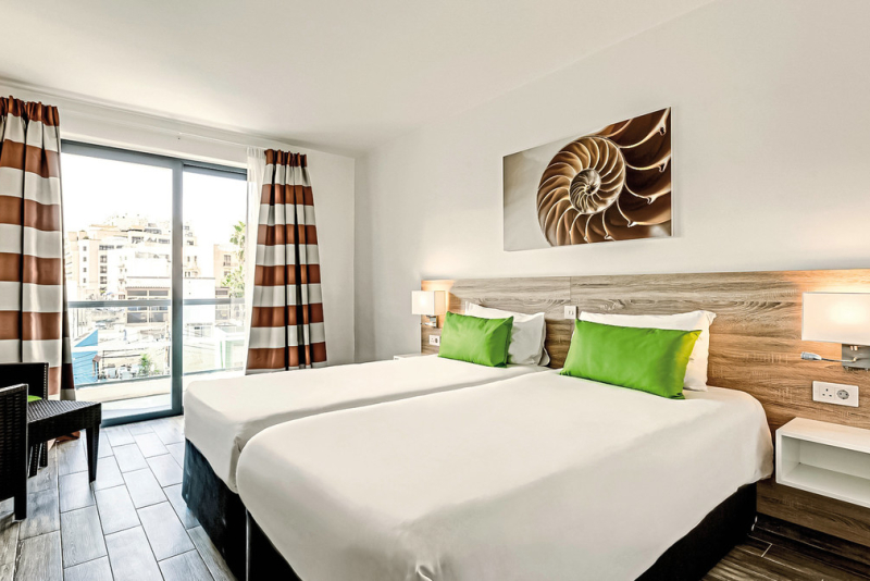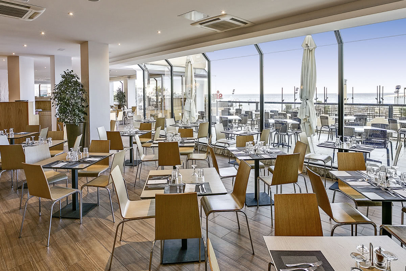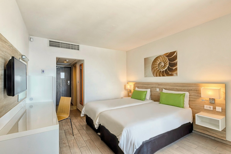 Es gibt Einzel- und Doppelzimmer sowie elegante Suiten. Alle Zimmer sind komfortabel ausgestattet mit Flachbildschirm, Safe, Föhn, einer Kaffee-/Teestation und WLAN. Außer den Economy-Zimmern haben alle Zimmer einen eigenen Balkon. Etliche Zimmer bieten zudem einen schönen Blick auf das Mittelmeer. Alle Räumlichkeiten sind mit einer Wärmedämmverglasung und eigenen Badezimmern versehen. Schon in den Economy-Zimmern gibt es barrierefreie Duschen. Es können in den gehobenen Kategorien bis zu drei Personen übernachten.Gastronomie / Restaurants