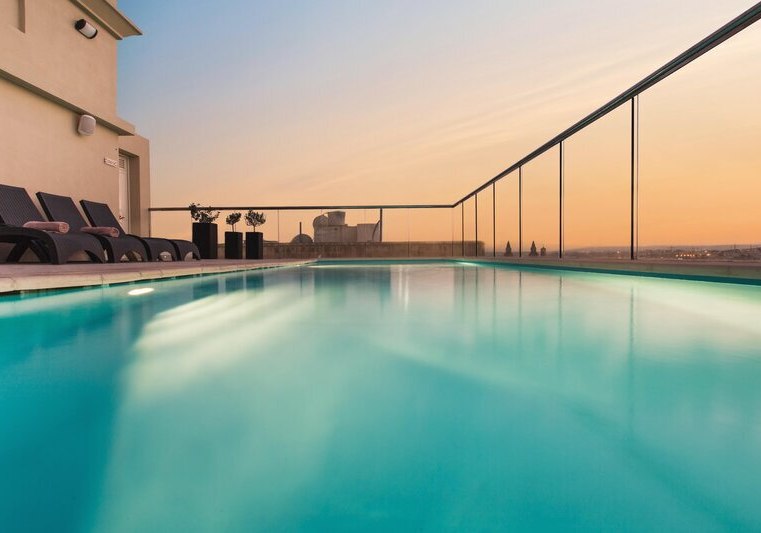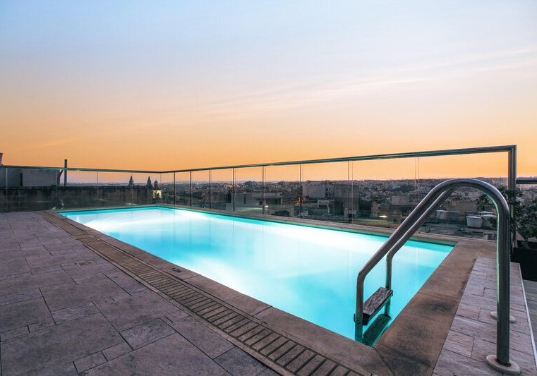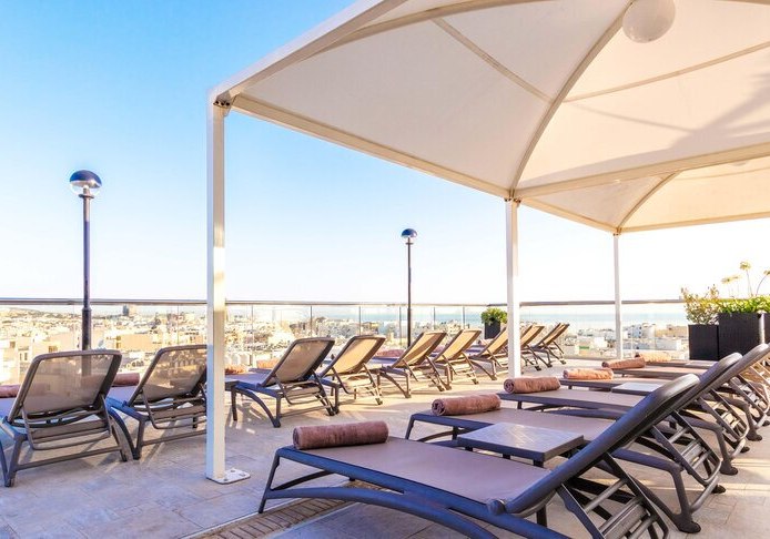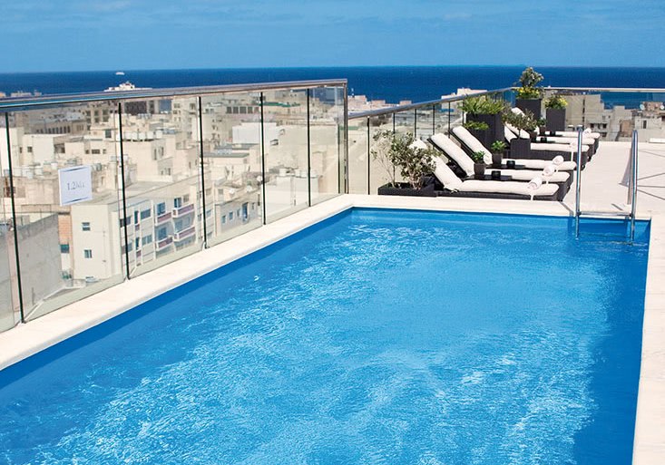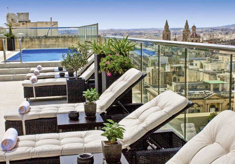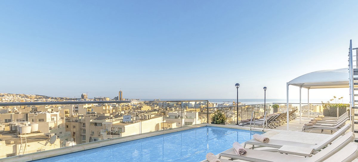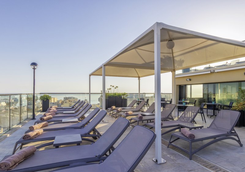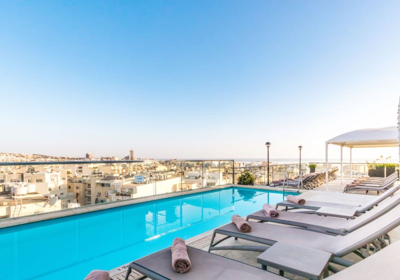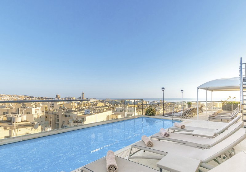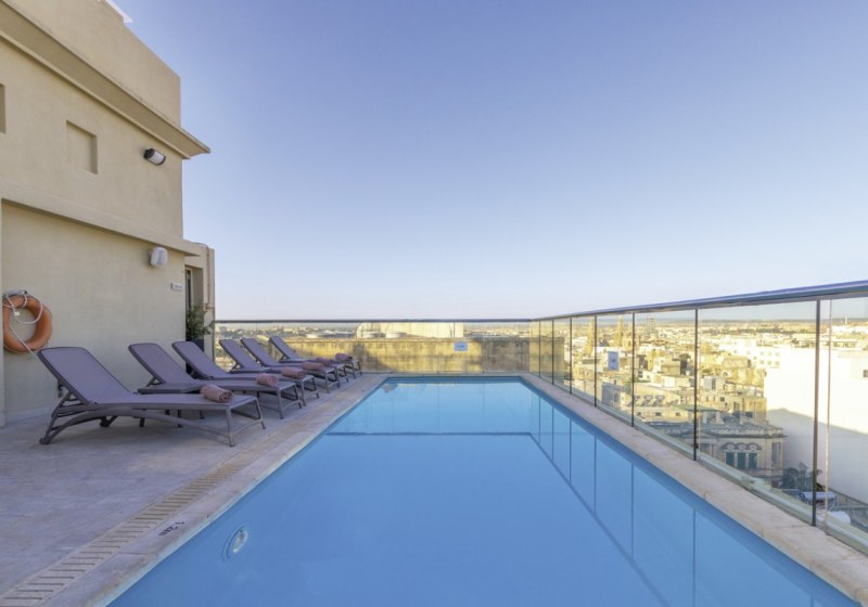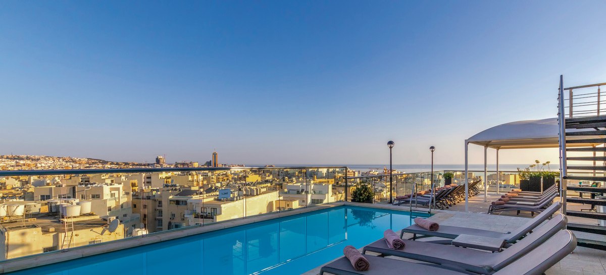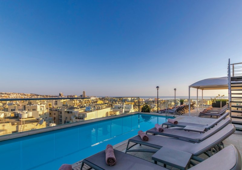 - Dachterrasse: Pool und Sonnenplätze mit Blick über Sliema für entspannte Pausen.