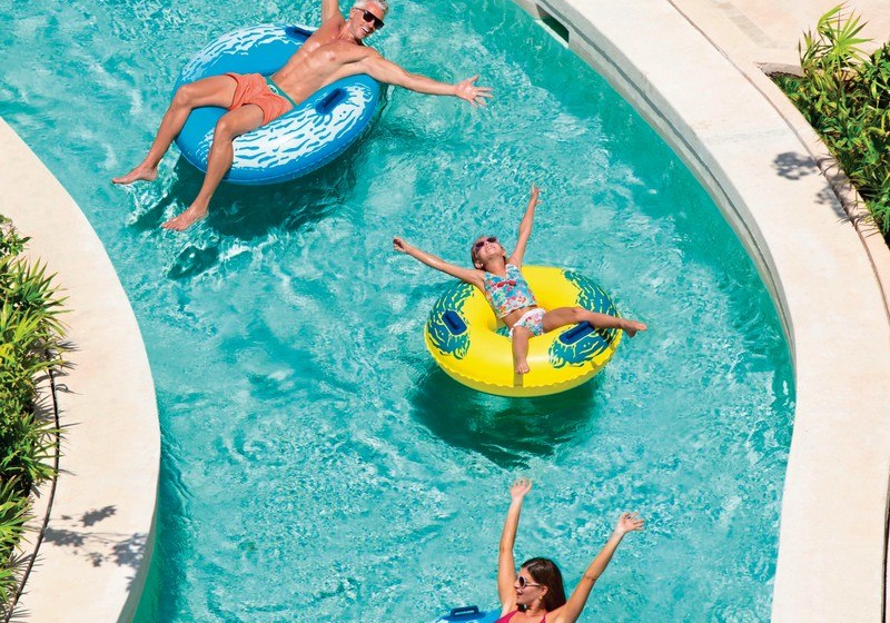 Die Anlage ist großzügig geplant: Infinity- und Oceanview-Pool, Kinderpool, fünf Whirlpools, Wasserpark und Lazy River verteilen sich um weitläufige Sonnenterrassen. Liegen, Sonnenschirme und Badetücher sind an Pool und Strand bereitgestellt, WLAN ist inklusive. Das Theater, diverse Shops und ein Café erweitern die öffentlichen Bereiche.