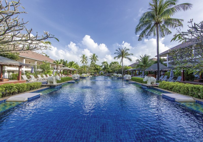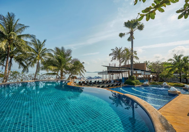 Bandara Spa Resort & Pool Villas, Samui kombiniert direkte Strandlage am Bophut Beach mit einer klar gegliederten Anlage, zwei Außenpools und familienfreundlichen Angeboten vom Kidsclub bis zur Familiensuite. Kulinarisch erwarten Euch thailändische Gerichte und internationale Küche mit flexiblen Verpflegungsoptionen.