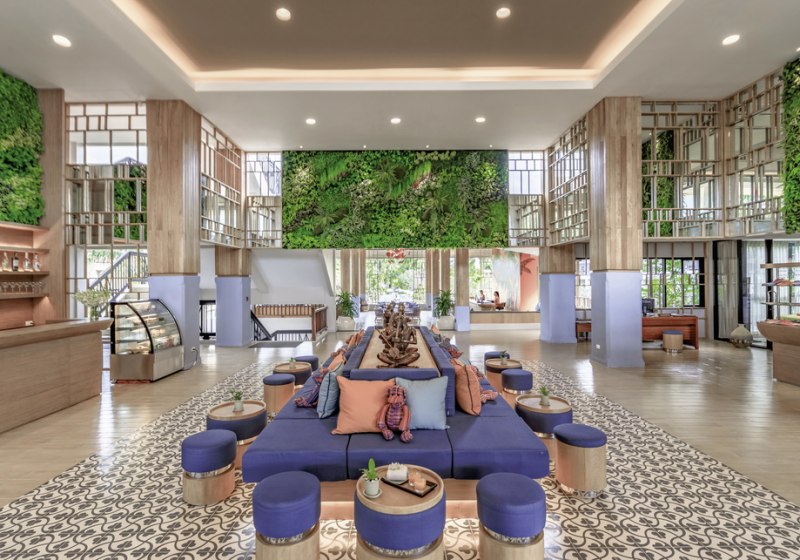 Die öffentlichen Bereiche wirken klar gegliedert: eine offene Lobby mit Rezeption, Sonnenterrassen sowie Liegen und Schirme an Pool und Strand. Zwei Außenpools und ein separates Kinderbecken strukturieren den Tag. WLAN nutzt Ihr in der gesamten Anlage, die sich als tropische Gartenwelt bis zum Strand zieht.