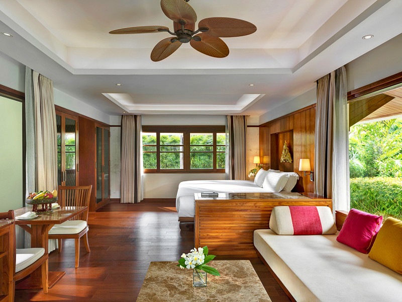 Viele Details erhöhen den Komfort: Bademäntel, Haartrockner, Kosmetikspiegel, Dusche oder Badewanne, Schreibtisch und Sitzbereich. Betten variieren von Twin bis King. Einige Einheiten bieten Garten-, Pool-, Strand- oder Meerblick. Schallisolation und Parkett/Holz unterstreichen die Ruhe. Highlight: Villen mit Privatpool für maximale Zurückgezogenheit.