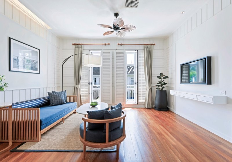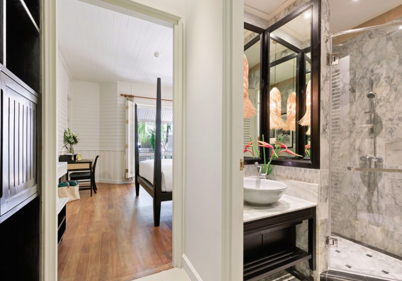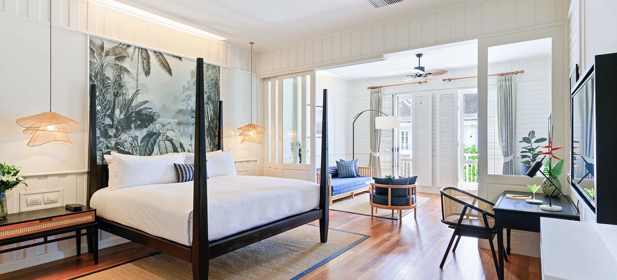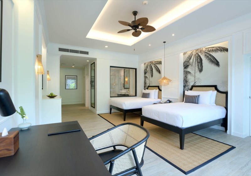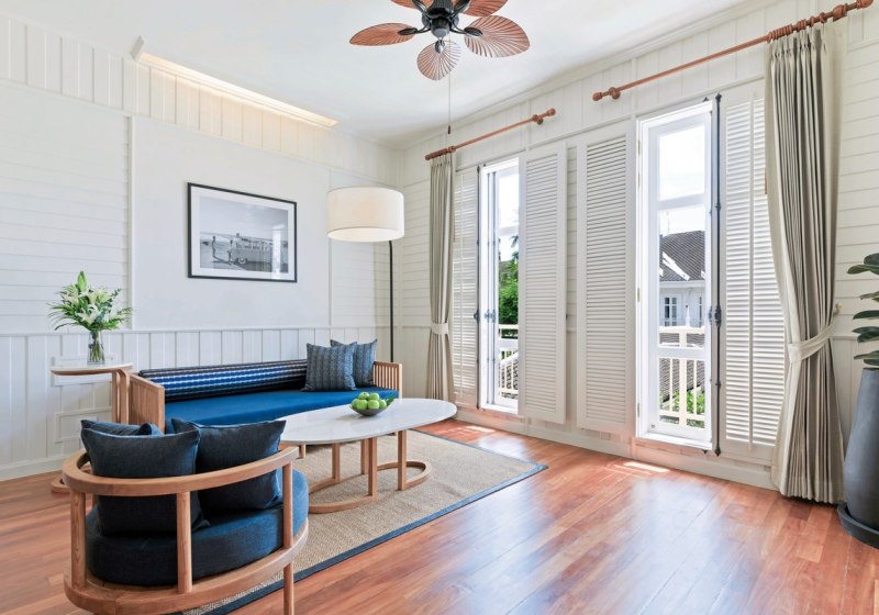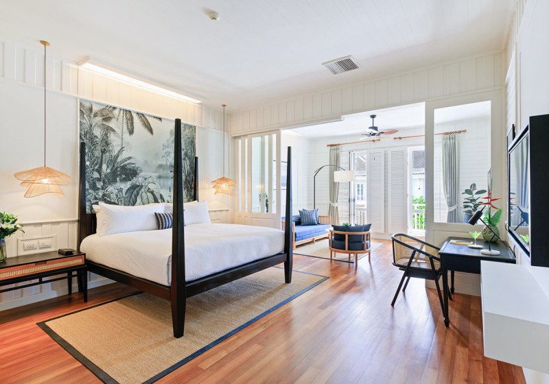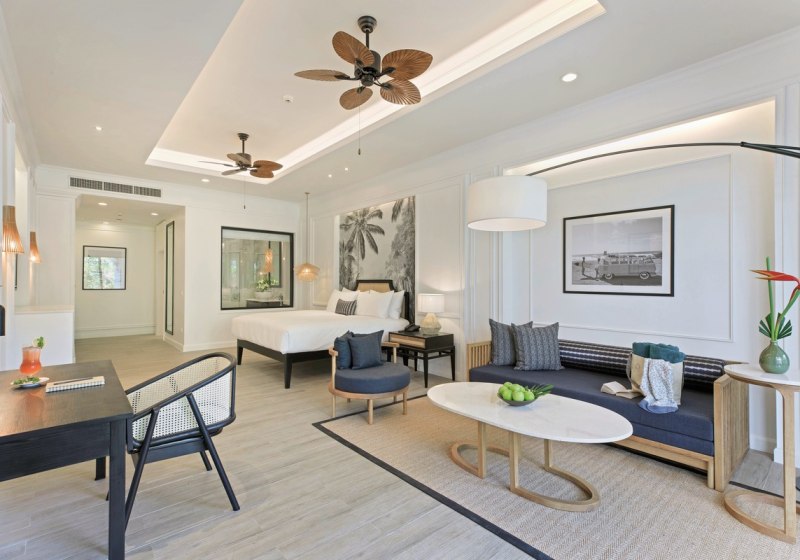 Die Deluxe Suite „Lamai“ misst circa 80 Quadratmeter, liegt in der zweiten Etage und verfügt über einen kleinen Balkon. Der zusätzliche Platz eröffnet eine entspanntere Raumwirkung für längere Aufenthalte. Damit richtet Ihr Euch komfortabel ein, ohne Überfrachtung. Highlight: Großzügige Suite mit klarem Layout für mehr Bewegungsfreiheit.