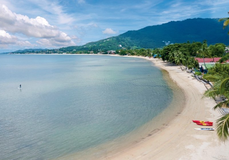 Ihr wohnt in Maret auf Koh Samui, direkt gegenüber vom Sandstrand; lediglich eine Straße liegt dazwischen. Ein eigener Strandabschnitt sorgt für geordnete Bereiche am Meer. Bis zum belebten Chaweng Beach sind es etwa neun Kilometer, zum Flughafen Koh Samui rund vierzehn Kilometer, was An- und Abreise angenehm planbar macht. Highlight: Klare Anbindung an Strand, Chaweng und den Flughafen.