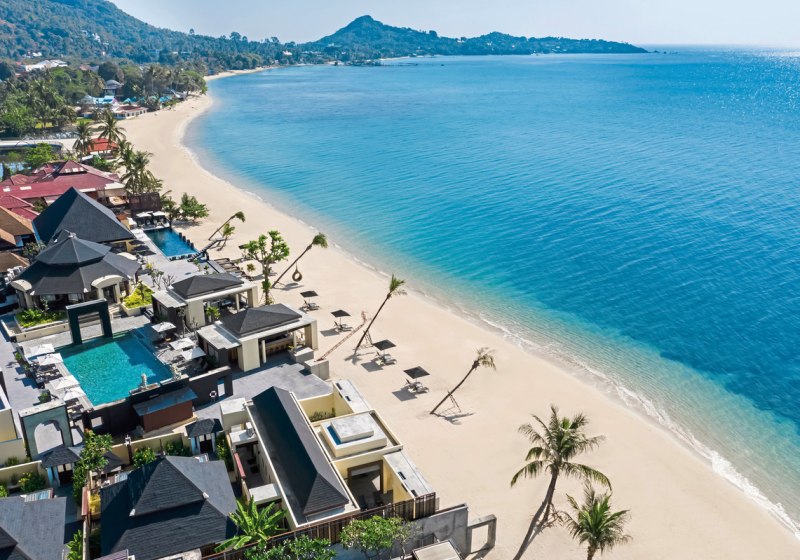 Ihr richtet Euch in Zimmern, Suiten oder Villen ein – teils mit Outdoor-Badewanne oder privatem Plunge Pool. Am Meer wartet die ruhige Kulisse von Lamai Beach, während Live-Musik Abende stimmungsvoll ausklingen lässt. Familien, Strandurlauber und Paare finden gleichermaßen passende Bereiche. Highlight: Direkte Strandlage. Ihr wohnt am Lamai Beach mit Strandpool.