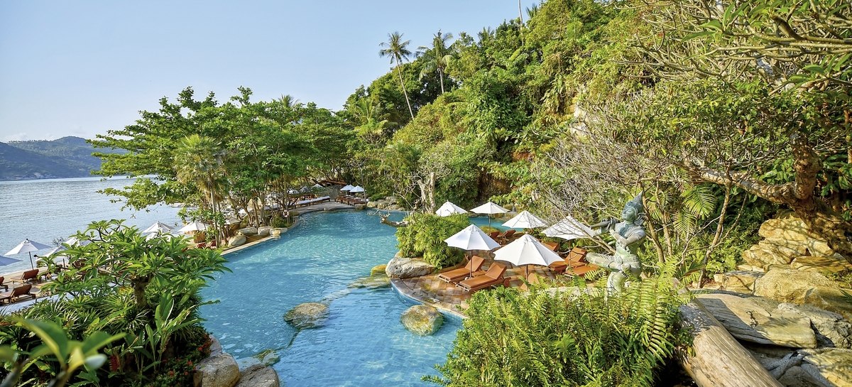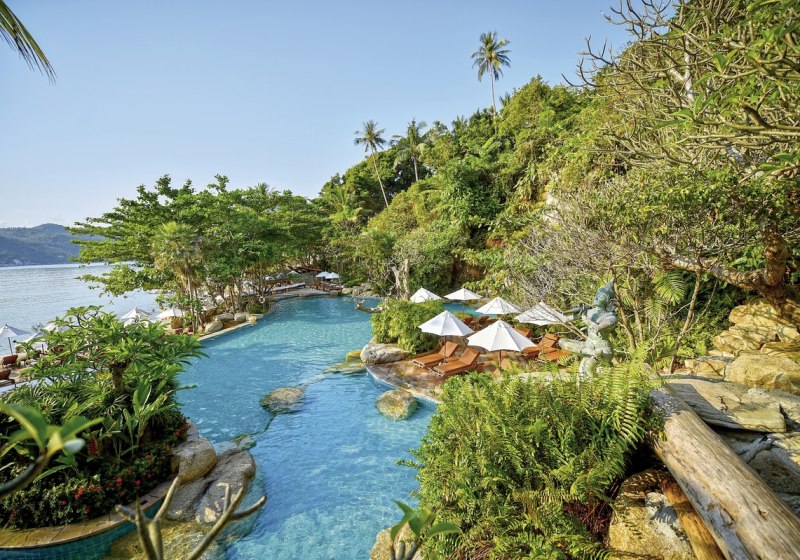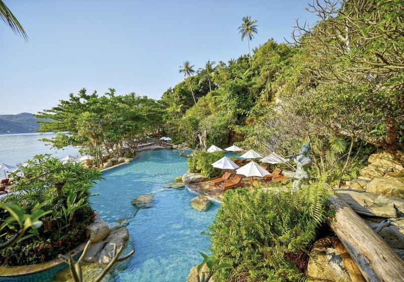 Die Gemeinschaftsbereiche wirken gepflegt und einladend: ein Süßwasserpool mit Kaskaden-Wasserfall, schattige Terrassen und eine Strandbar. Familien profitieren von Kinderpool und Betreuung, Paare von ruhigen Ecken und Villen mit eigenem Pool. Kulinarisch wählt Ihr in drei Restaurants zwischen thailändischer Küche und internationalen Klassikern – flexibel passend zu den Ferien.