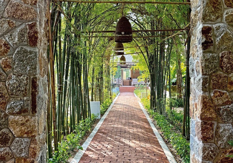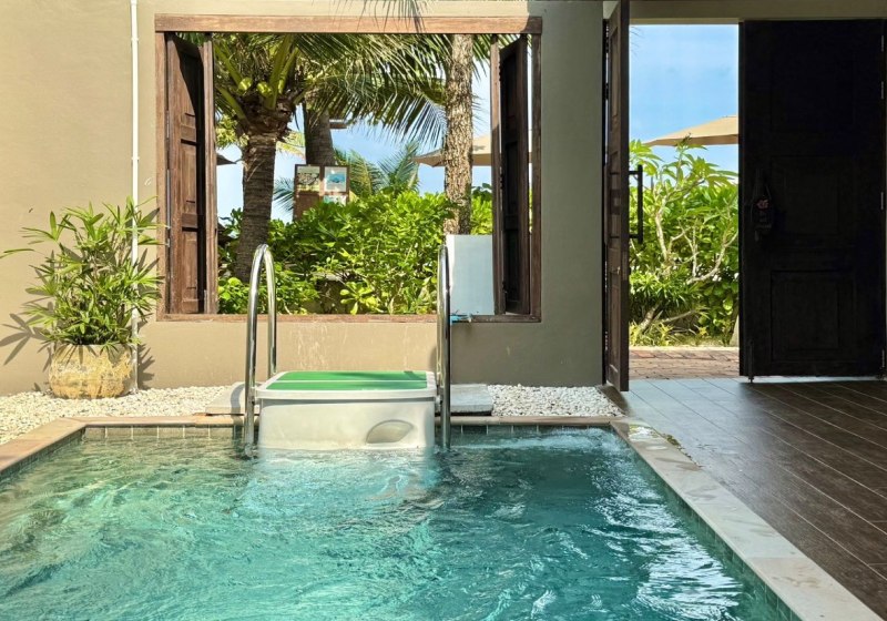 In Saree Samui wohnt Ihr in einer Anlage, die als thailändisches Dorf konzipiert ist. Holz, Grün und offene Wege prägen das Bild, dazwischen viel Ruhe und klare Strukturen. Die Villen verteilen sich in einer gepflegten Gartenanlage, wodurch Ihr Privatsphäre und kurze Wege zugleich erlebt. Direkt davor liegt der Maenam Beach, ein langer Strandabschnitt, der Euren Tagesrhythmus bestimmt: erst Meer, dann Pool, später zurück auf die eigene Terrasse.