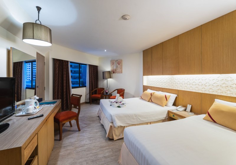 Im Jomtien Palm Beach Hotel & Resort wohnt Ihr in zwei miteinander verbundenen Gebäudeteilen mit 723 Zimmern, nur etwa 100 Meter vom Sandstrand von Jomtien entfernt. Die Atmosphäre ist entspannt und zugleich lebendig: In der Lobby mit Sitzgelegenheiten trefft Ihr Euch, plant den Tag oder nutzt das kostenfreie WLAN. Der Blick von der Dachterrasse mit Pool spannt sich über die Bucht – tagsüber zum Abkühlen, abends für ruhige Stunden über den Lichtern der Küste.