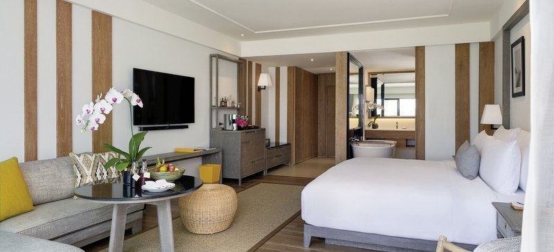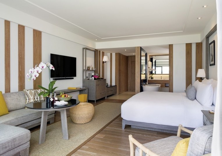 Zimmer und Suiten sind auf Komfort fokussiert: Dusche, Badewanne, WC, Haartrockner, Klimaanlage, Safe, Sat‑TV, Kaffee‑/Teezubereiter und Minibar bilden das Fundament. Viele Kategorien bieten Meer- oder Buchtblick, teils mit möbliertem Balkon. In Suiten liegen Bademantel und hochwertige Badartikel bereit. Highlight: Blickachsen zur Bucht prägen das Wohngefühl.