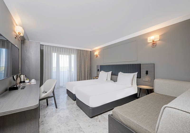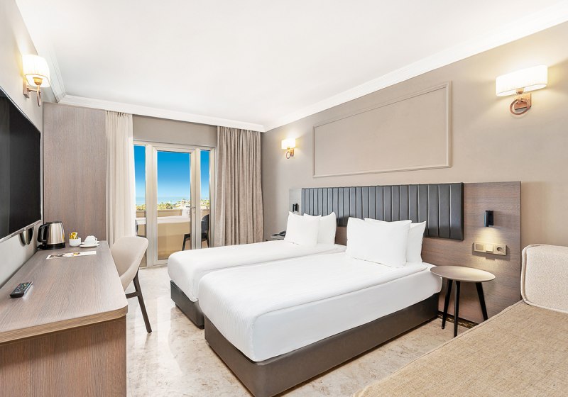 Eure Zimmer sind mit Klimaanlage, Minibar, Safe und Sat‑TV ausgestattet; je nach Kategorie gehört ein Balkon dazu. Für unterschiedliche Bedürfnisse stehen Doppel- und Familienzimmer, getrennte Schlafzimmer und Zustell- oder Kinderbetten bereit. Ausgewiesene Ausblicke reichen je nach Lage von Garten bis Meer.