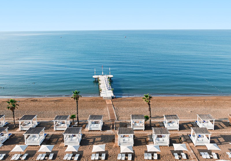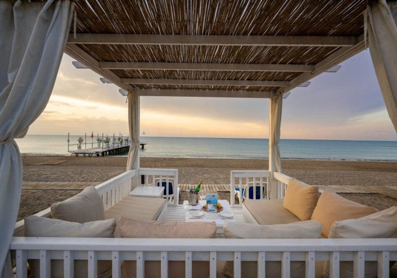 Ihr wohnt in Belek direkt am Sand‑Kiesstrand – das Meer liegt nur wenige Schritte entfernt. Die Lage verbindet Ruhe am Strand mit schneller Anbindung: Eine Bushaltestelle erreicht Ihr nach rund 100 Metern, zum Stadtzentrum sind es etwa 2 Kilometer. Golfer finden einen Platz in rund 1.000 Metern Entfernung, was spontane Runden erleichtert.