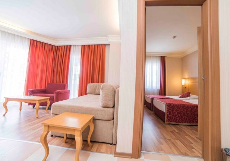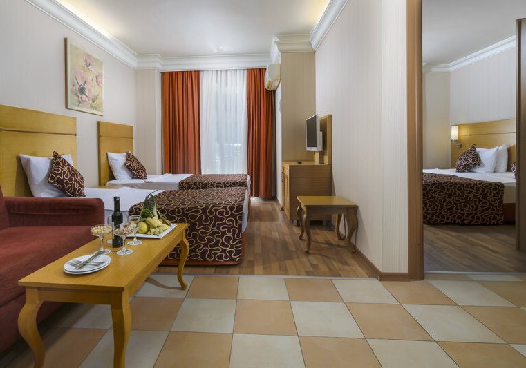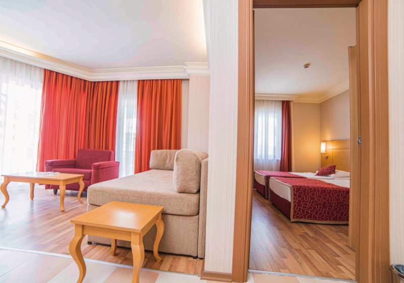 Familienzimmer bieten einen Wohn‑/Schlafraum plus separates Schlafzimmer mit Verbindungstür sowie doppelte Ausstattung bei Klimaanlage, Minibar und TV. Juniorsuiten (ca. 46 m²) und Suiten (ca. 46 m²) setzen auf orthopädisches Doppelbett; die Suite ergänzt um Balkon mit privater Sauna und Whirlpool. Telefon teils als Direktwahl, Split‑Klimaanlagen in den Suiten und Juniorsuiten. Babybetten sind auf Anfrage verfügbar.