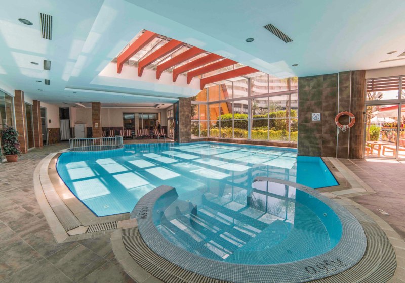 • Liegestühle • Hallenbad • Außenpool • Sonnenschirme • Pool • Poolbar • Sonnenterrasse • Badetücher • Wasserrutsche • Wasserpark