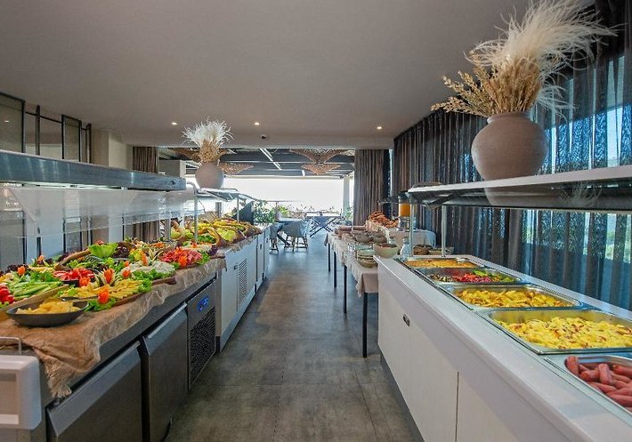Ihr wählt flexibel zwischen All‑Inclusive, Halbpension, Vollpension, Frühstück oder Übernachtung mit Frühstück. Das Restaurant bedient Euch mit Buffet am Morgen, dazu ergänzen Café, Bar und Snackbar den Tag mit leichten Häppchen und Getränken. Am Strand steht eine Strandbar bereit – praktisch zwischen Badegang und Liegepause.