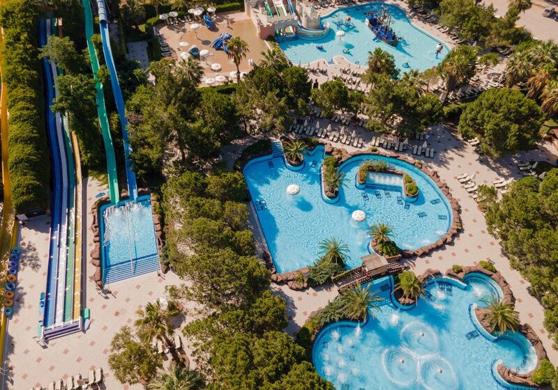 Das Rückgrat der Anlage bilden 24-Stunden-Rezeption und umfassendes WLAN in Lobby, Außenbereichen und Zimmern. Der Wasserpark mit 25 Rutschen, zwei Pools – darunter ein Relaxpool für Erwachsene – sowie ein fein organisierter Strandbereich markieren die zentralen Treffpunkte.