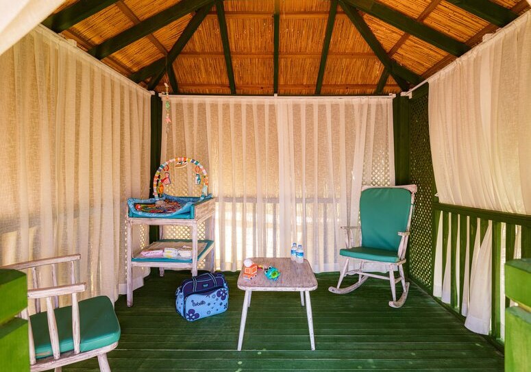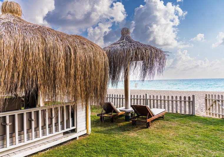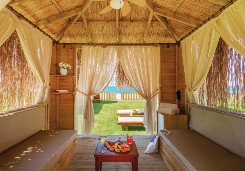 - Strandkomfort: Privater Sand-/Kieselstrand mit Pavillons, Liegen, Schirmen und Tüchern.