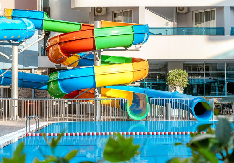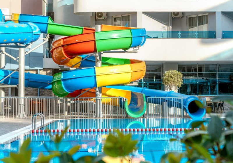 - Pool & Rutschen: Außenpool mit Kinderbecken und separaten Wasserrutschen.