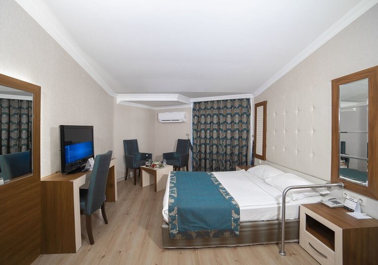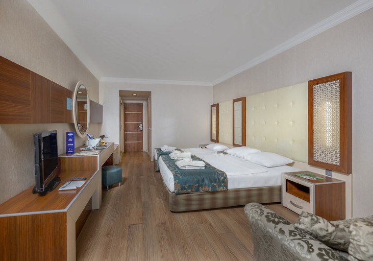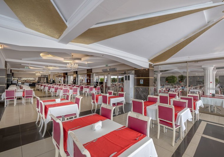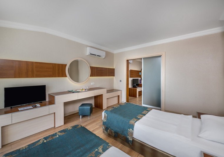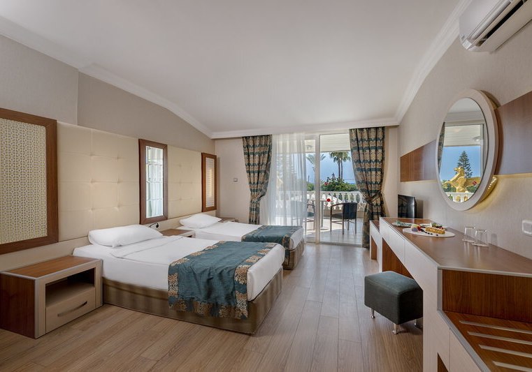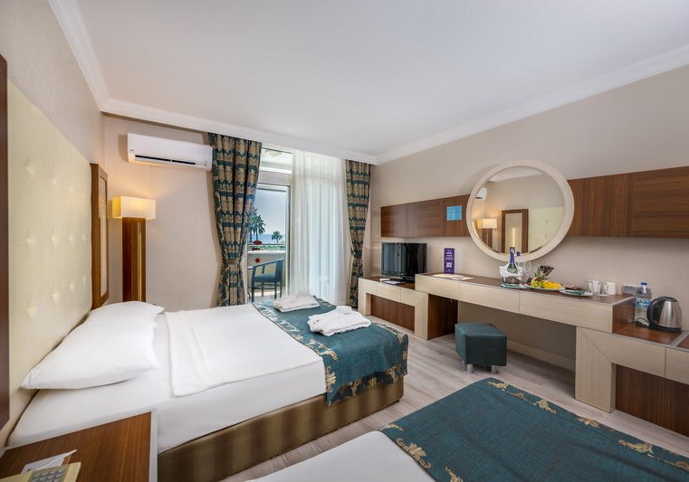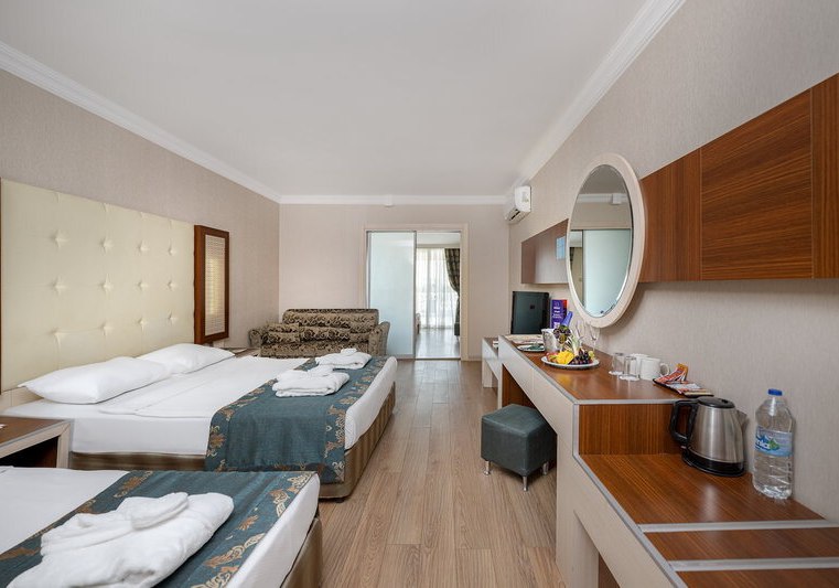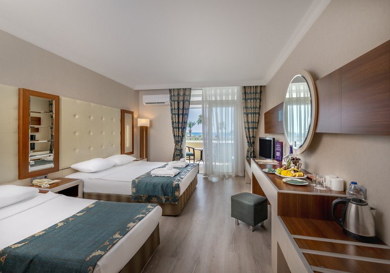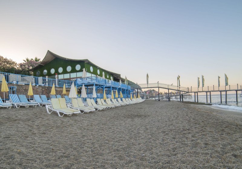 Im Beach Club Doganay wohnt Ihr direkt am Sand-/Kiesstrand von Konakli, mit zwei Außenpools, Kinderbecken und einer Wasserrutsche als belebtem Mittelpunkt. Die weitläufigen Gemeinschaftsbereiche mit Lobby, Garten und Sonnenterrassen wirken strukturiert und klar organisiert. Familien und Strandurlauber finden hier ein Angebot, das Badezeit, Spiel und sportliche Abwechslung nahtlos verbindet.