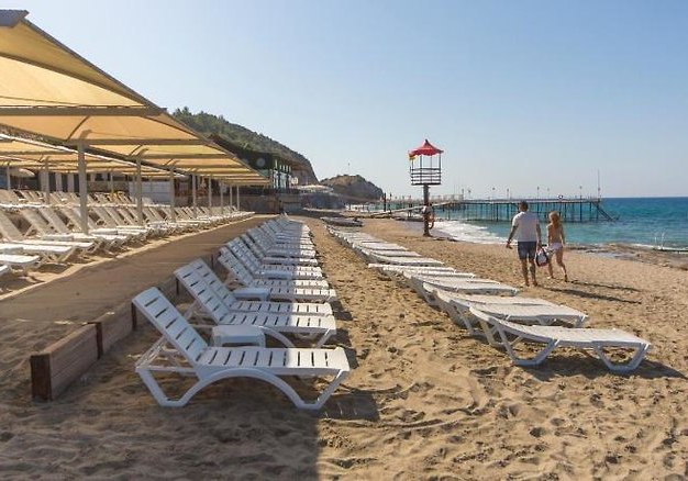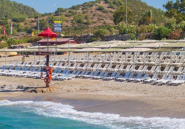 - Strandlage nah: Direkt am Sand-/Kiesstrand mit Liegen und Schirmen ausgestattet.