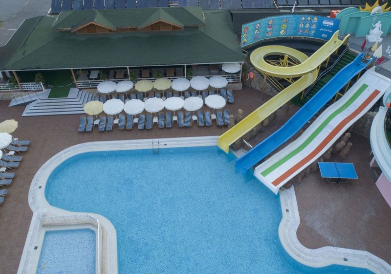 - Pools & Rutsche: Zwei Außenpools, Kinderbecken und eine Wasserrutsche.