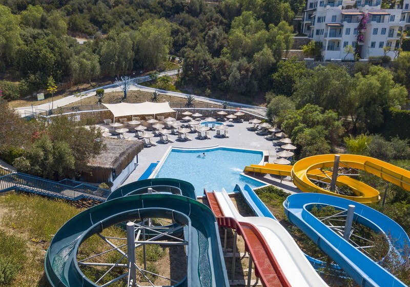Die Anlage ist weitläufig angelegt: drei Außenpools, Aquapool mit vier Wasserrutschen und drei Kinderbecken prägen den Tag am Wasser. Liegen, Sonnenschirme und Badetücher sind an Pool und Strand vorhanden, dazu ein Badesteg. WLAN ist in der gesamten Anlage und in allen Zimmern verfügbar.