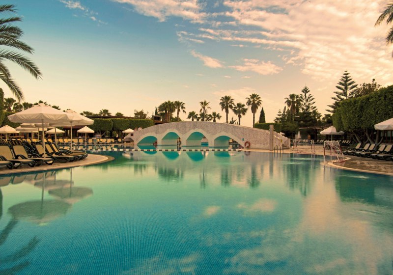 Die Anlage umfasst 534 Zimmer in mehreren drei- bis vierstöckigen Gebäuden, teils mit Lift. Ihr passiert Rezeption und Geschäfte, nutzt WLAN in der gesamten Anlage – außer im Hauptrestaurant – und verteilt Euch auf zwei große Süßwasserpools mit Sonnenterrasse. Ein separates Kinderbecken schafft Übersicht für Familien.