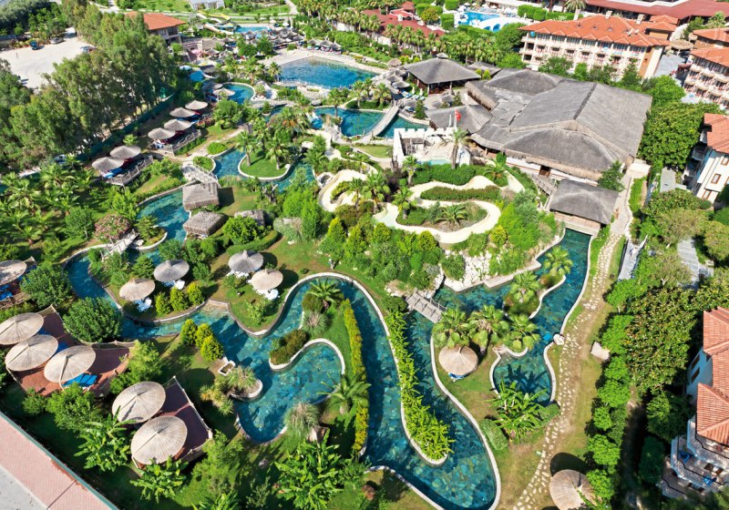 Im Club Grand Side wohnt Ihr in einer weitläufigen Anlage direkt am flach abfallenden Sandstrand. Mehrere drei- bis vierstöckige Gebäude, teils mit Lift, gruppieren sich um zwei Süßwasserpools mit Sonnenterrasse. Das Herzstück: der 4.500 m² große Aquapark „Amazon Water World“ mit Wellenbad, Rutschen, Wasserkanälen und großem Kinderbereich – ein lebendiger Treffpunkt für Paare und Familien.
