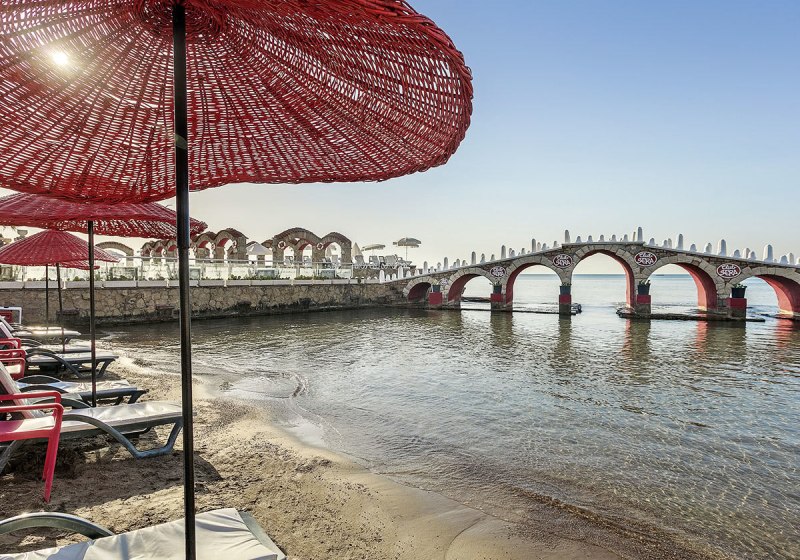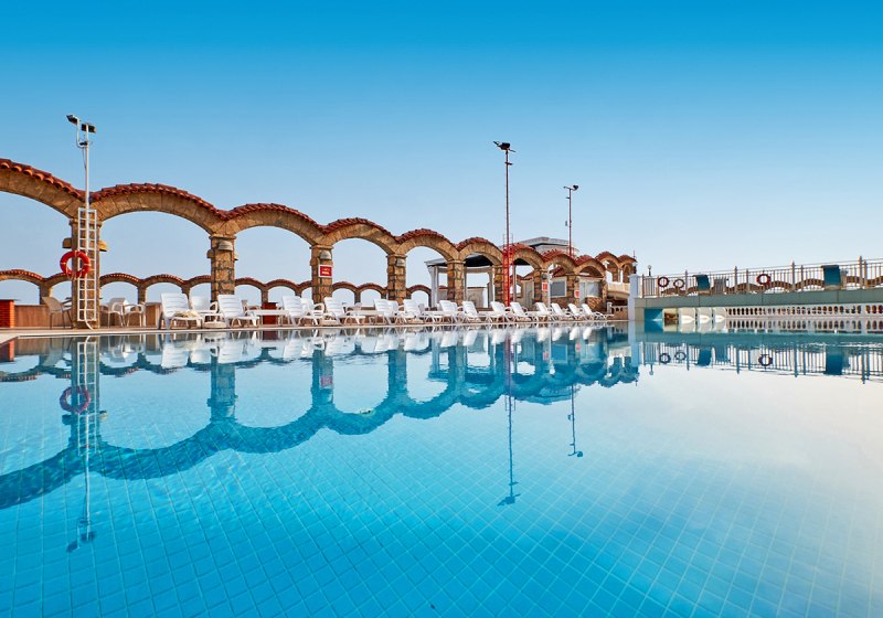 An den Pools und am Strand nutzt Ihr Liegen, Sonnenschirme und Badetücher. Eine künstliche Sandbucht und Badeplattformen ergänzen den Zugang zum Meer. Drei Außenpools, darunter ein Meerwasserpool mit drei kleinen Wasserrutschen, sowie ein Hallenbad bieten Platz für Abkühlung und Bahnen.