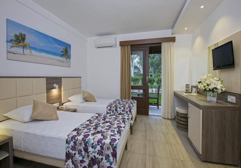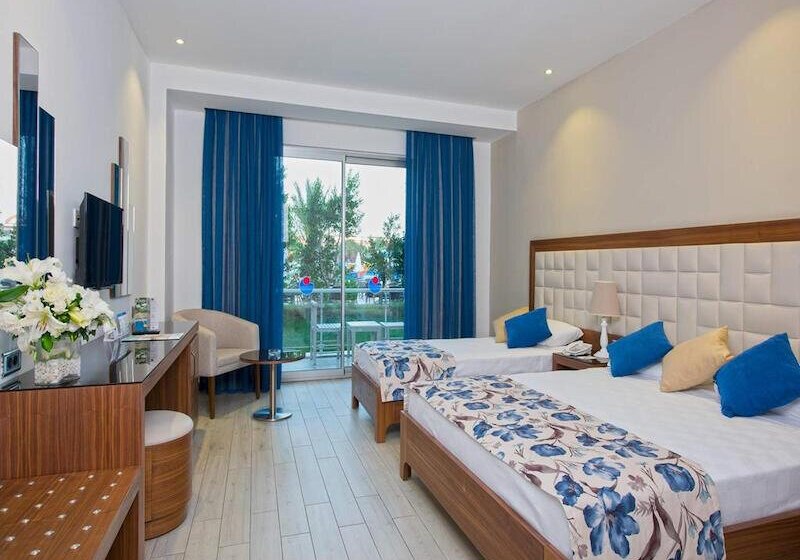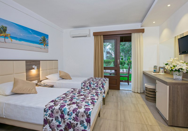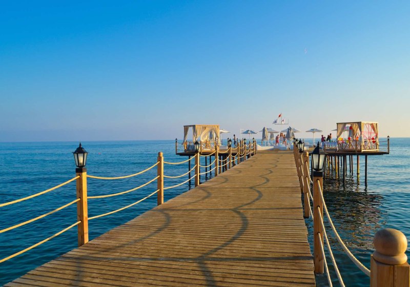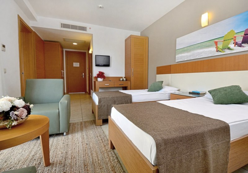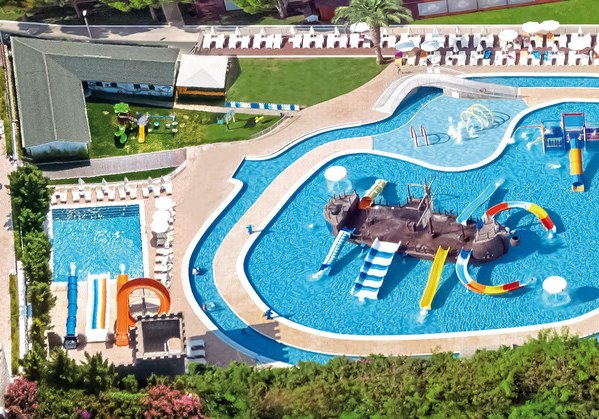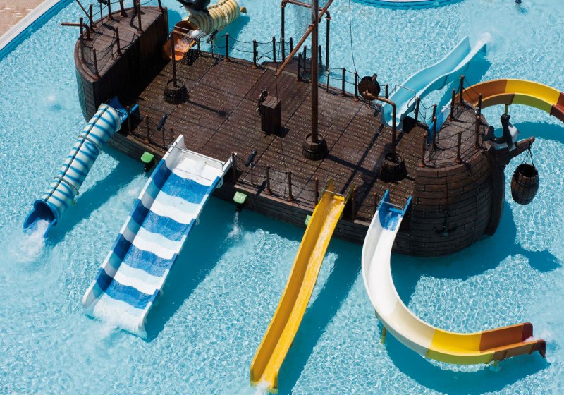 Die Infrastruktur ist umfangreich: Rezeption und Geschäfte, WLAN in der gesamten Anlage sowie drei Süßwasserpools mit Kinderbecken und Sonnenterrassen. Am Strand und Pool nutzt Ihr Liegen, Auflagen, Handtücher und Schirme, zusätzlich gibt es einen Badesteg. Highlight: Aquapark mit Wasserrutschen und Piratenschiff.