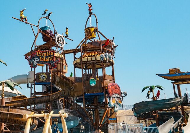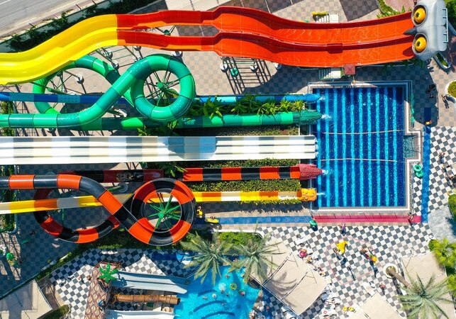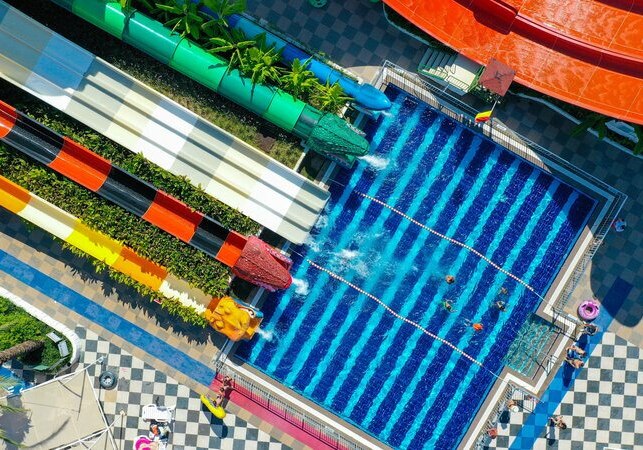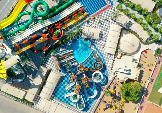 • Liegestühle • Hallenbad • Außenpool • Sonnenschirme • Poolbar • Sonnenterrasse • Badetücher • Wasserrutsche • Wasserpark • Pool