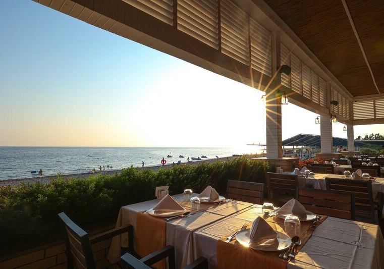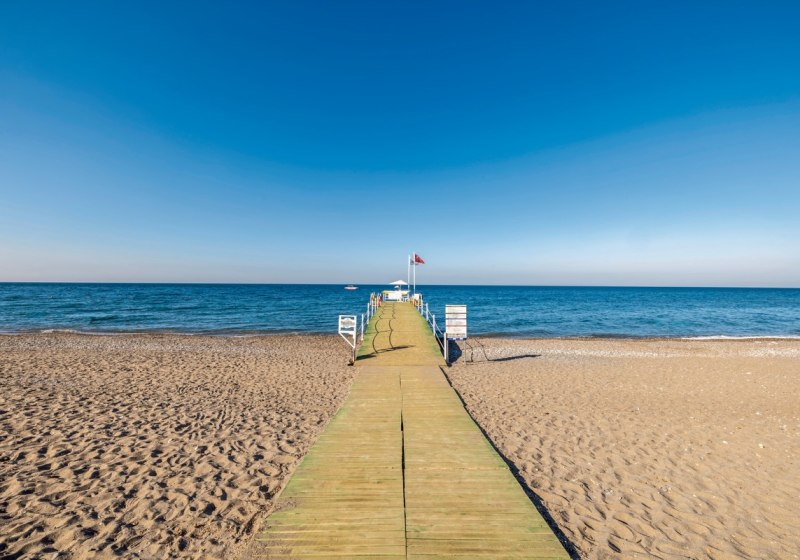 Ihr residiert direkt an der Küstenstraße Antalya–Mersin Richtung Alanya. Der hoteleigene Kies-/Sandstrand liegt etwa 50 Meter entfernt und ist über eine Unterführung erreichbar. Taxi- und Minibus-Verbindungen starten vor dem Hotel, sodass Ihr flexibel zwischen Strandzeit und Ausflügen wechselt.
