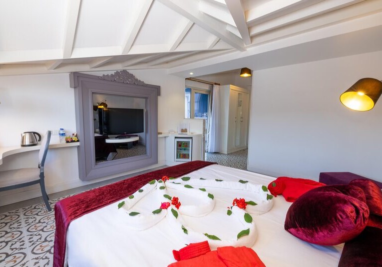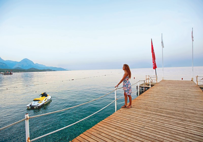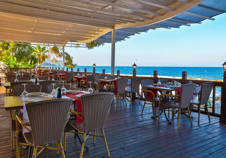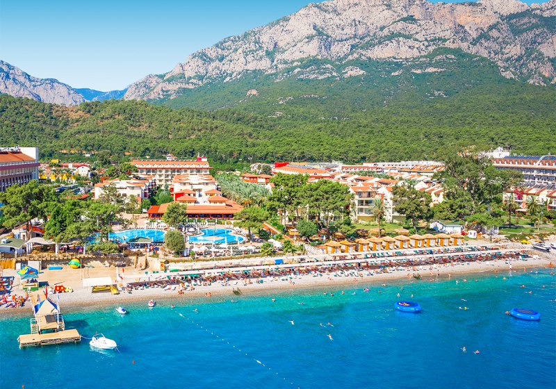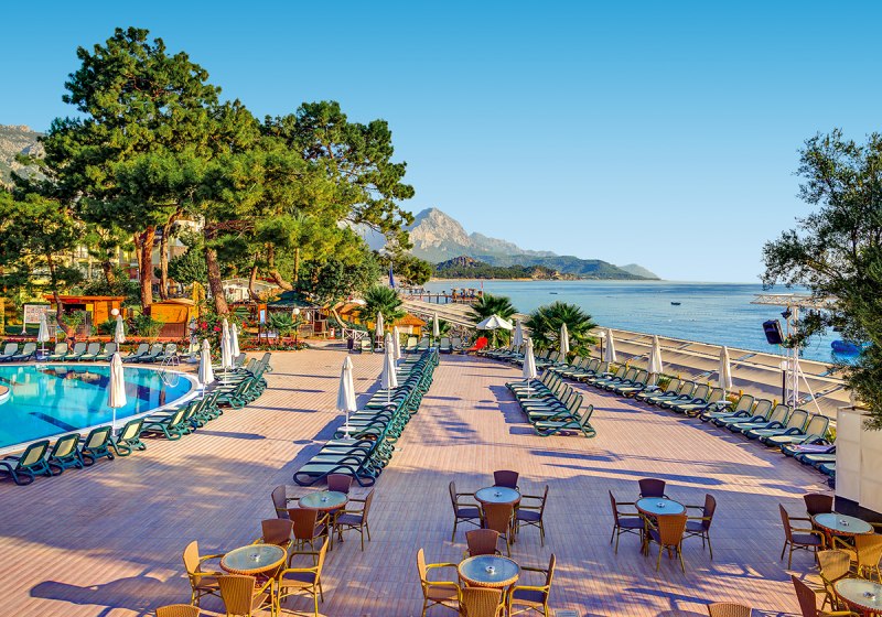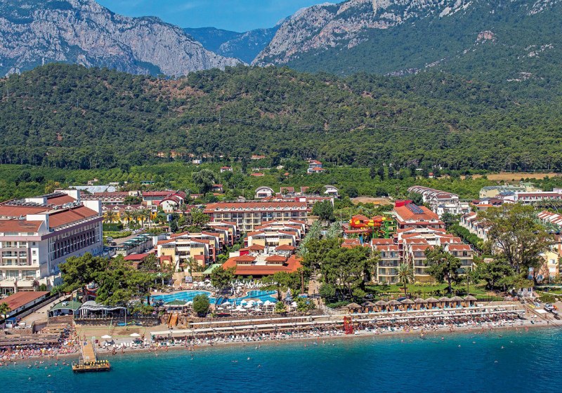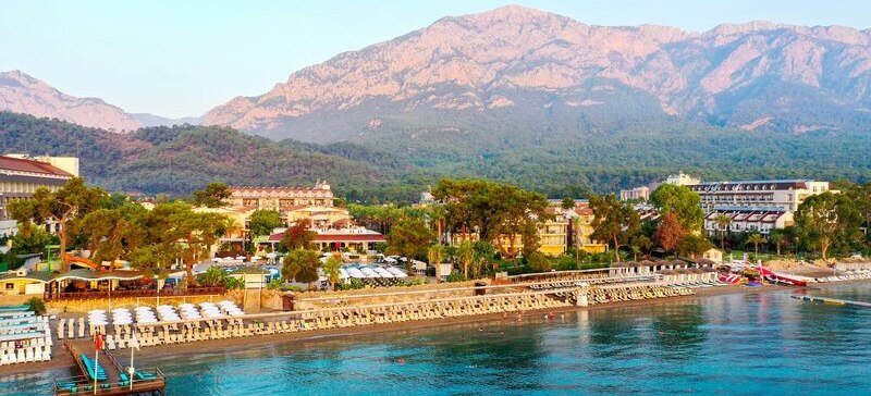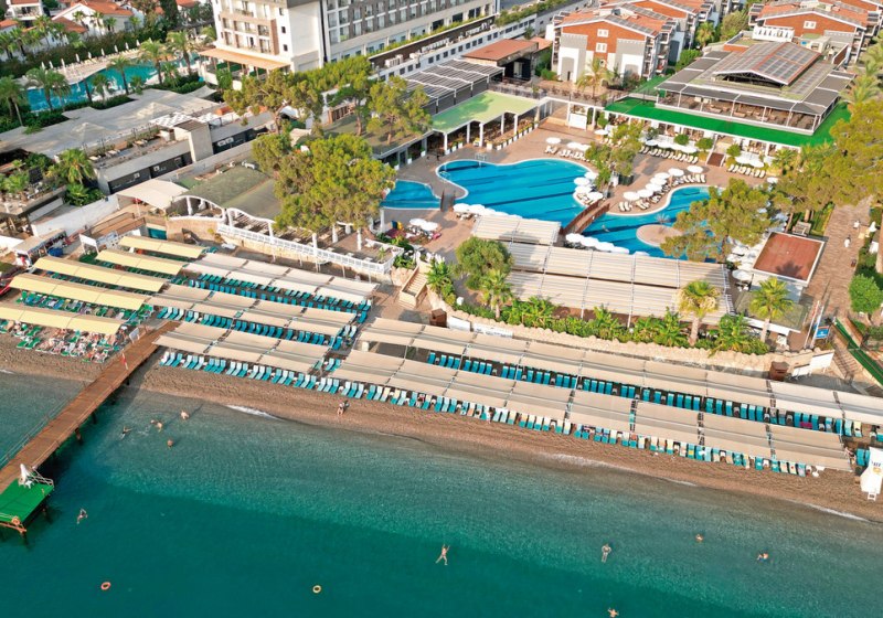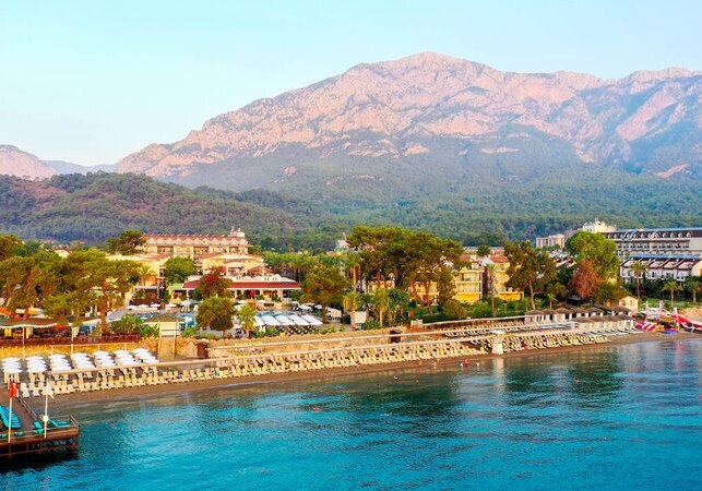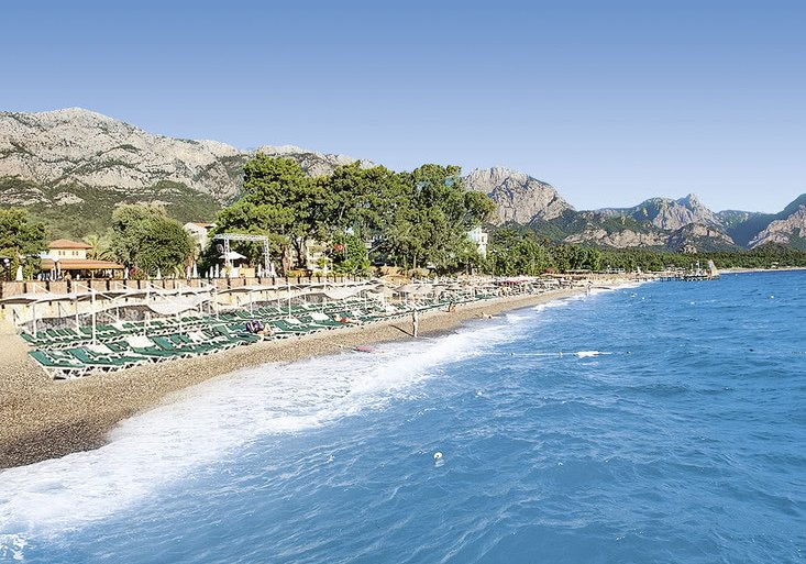 Die Lage ist eindeutig strandorientiert: Ihr tretet aus dem Resort direkt auf den hoteleigenen Kiesstrand mit Badesteg. Das Meer liegt faktisch vor der Tür; Liegen, Sonnenschirme und Badetücher stehen am Strand bereit. Wer Abwechslung sucht, erreicht das Zentrum von Kemer nach etwa einem Kilometer – perfekt für einen Bummel oder einen Abend in der Stadt. Vor dem Hotel warten Taxis und Minibusse, sodass Ihr spontan mobil bleibt.