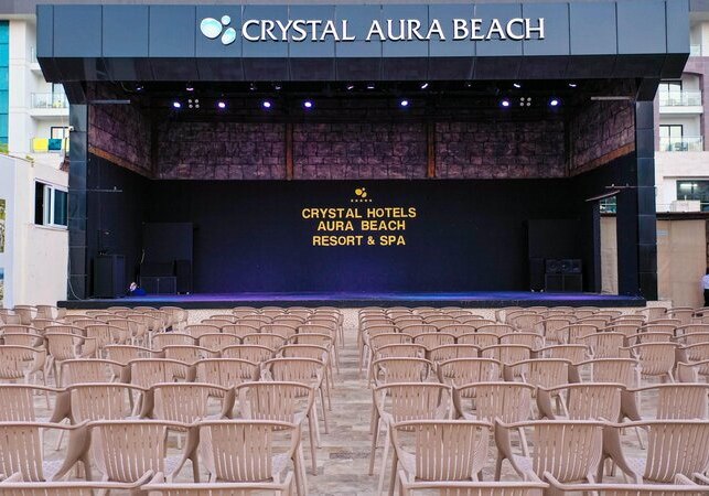 Crystal Aura Aqua Collection verbindet direkten Strandzugang mit lebendiger Ferienenergie. Ihr wohnt an einem hoteleigenen Kiesstrand mit Badesteg, zwischen Süßwasserpools, Sonnenterrassen und Wasserrutschen. Die weitläufigen Außenbereiche wirken wie kleine Bühnen: mal ruhig am Morgen, später mit heiterem Treiben rund um Poolbar und Snackbar. Familien finden kurze Wege, Sportbegeisterte viele Optionen, und wer Unterhaltung schätzt, hat abends Programm im Amphitheater.