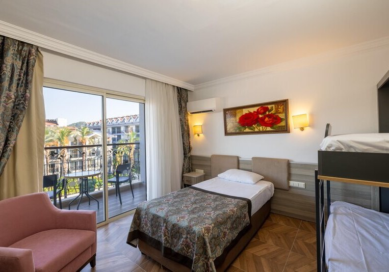 Ihr wählt zwischen Doppelzimmern und Familienzimmern, teils mit Etagenbett für eine klare Schlafstruktur. Babybetten sind auf Anfrage inklusive. Einige Zimmer bieten Garten‑, Berg‑ oder Poolblick, was die Lage im Resort spürbar macht. So entsteht ein unkompliziertes Wohngefühl mit den wichtigen Basics, ohne Schnörkel, aber mit funktionalem Komfort in den Ferien. Highlight: Familienzimmer teils mit Etagenbett für klare Aufteilung.