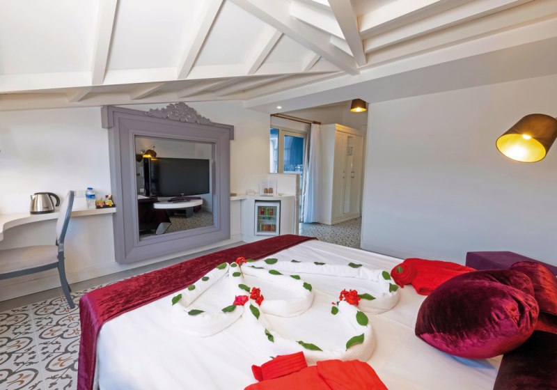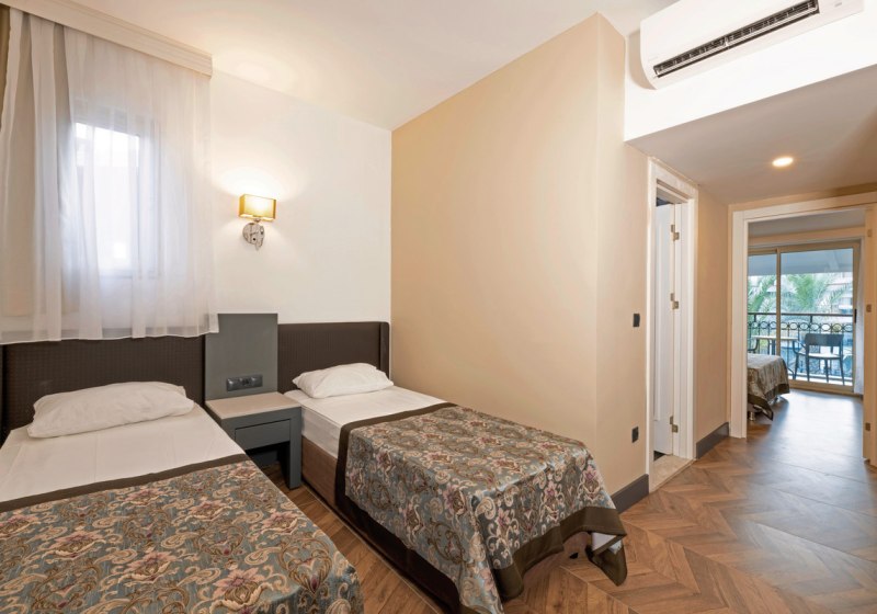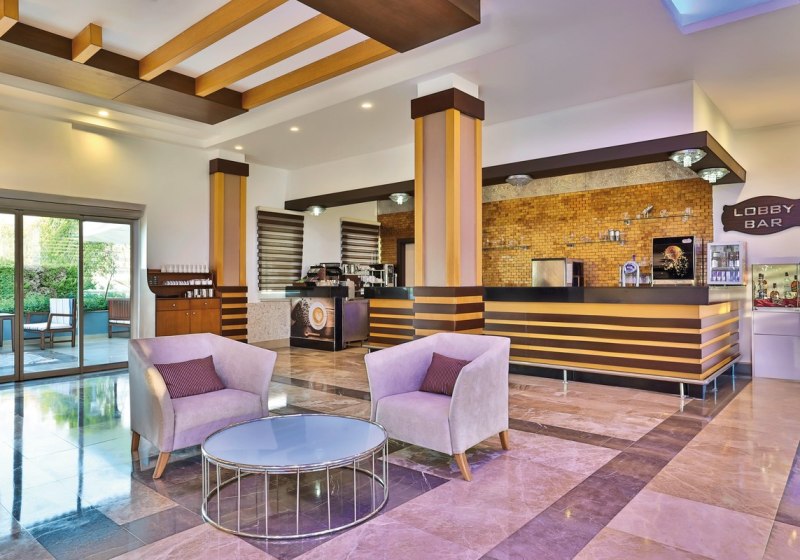 Im Inneren spürt Ihr die Logik eines großen Resorts: 531 Zimmer, Lobbybar und Empfangsbereich mit WLAN inklusive, dazu Einkaufspassage, Friseur, Konferenzraum und Indoorpool. Kulinarisch führt Euch der Tag vom Hauptrestaurant mit Terrasse über Bars bis zu À-la-carte-Optionen. All-Inclusive Plus mit inkludierten Getränken, Snacks und Kindermenüs hält den Rhythmus leicht planbar in den Ferien. Highlight: Direkter Strand mit Badesteg und zwei Rutschenpools für aktive Ferientage.