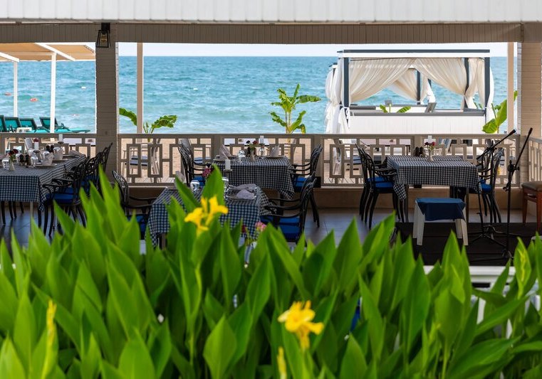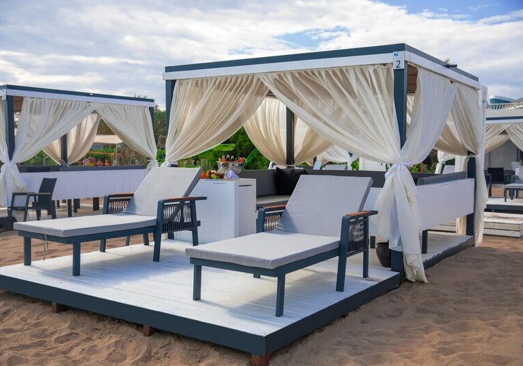 - Eigener Strand: Liegen, Schirme und Badetücher stehen direkt am Meer bereit.