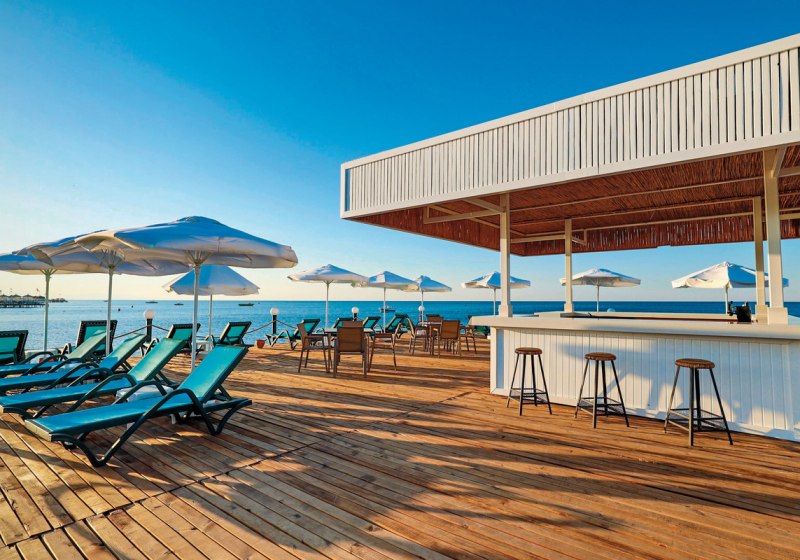 Draußen verteilen sich Süßwasserpool, Relax-Pool, Kinderpool und Sonnenterrassen mit Liegen, Schirmen und Badetüchern – auch am Strand. Zusätzliche Services reichen von 24-Stunden-Rezeption über Zimmerservice bis Tour-Desk, Transfer und medizinische Betreuung. Highlight: Lückenloses Service-Set von Gepäck bis Weckdienst.