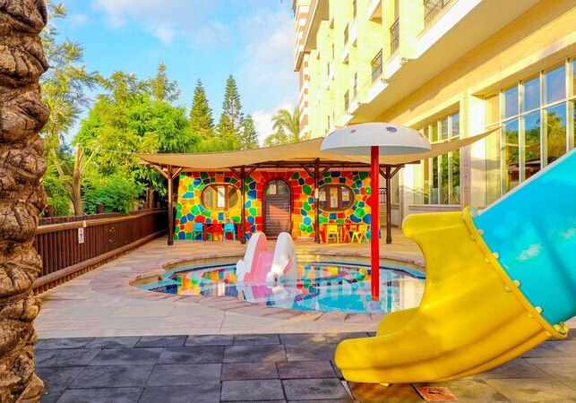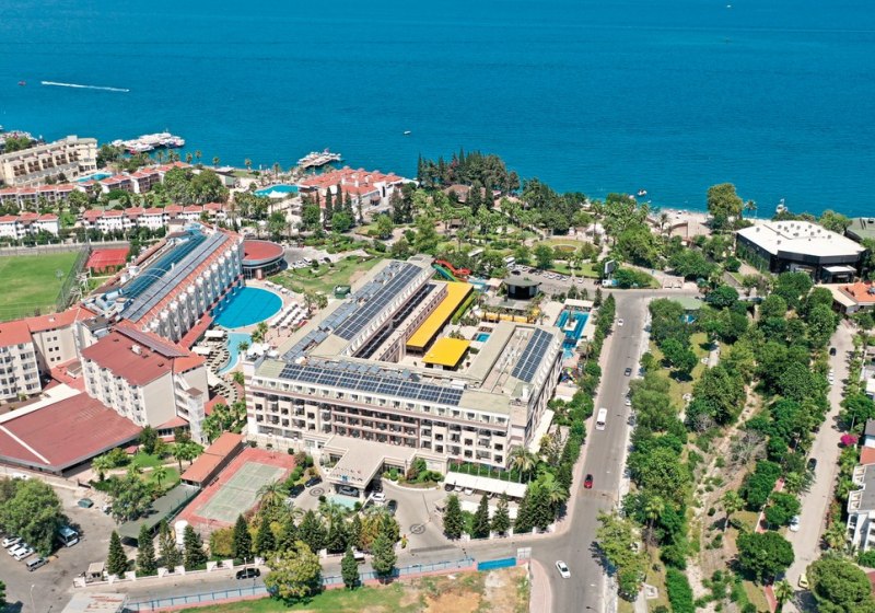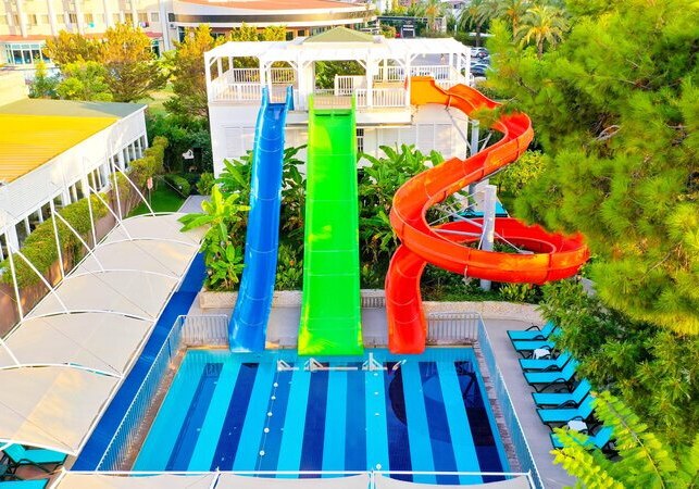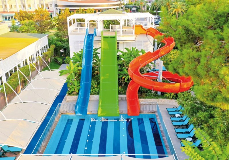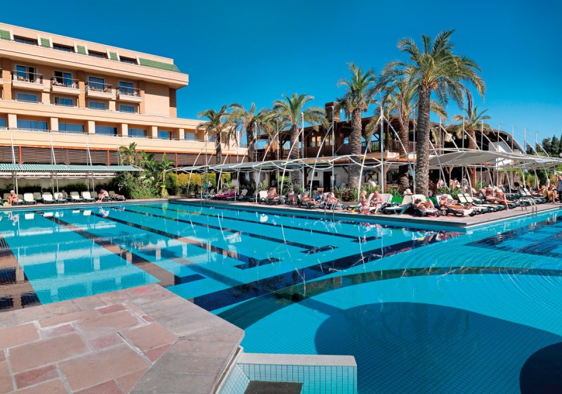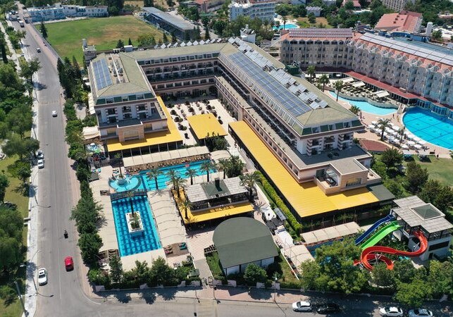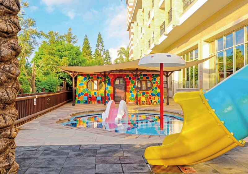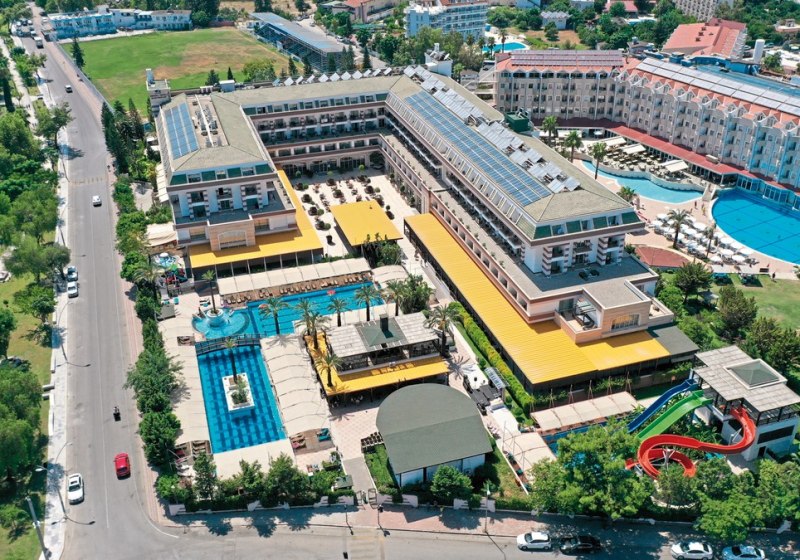 Das Haus bietet 356 Zimmer auf sechs Etagen, drei Lifte und durchgängiges WLAN. Zwei Außenpools, Aquapark, separates Kinderbecken sowie ein Hallenbad mit Kinderbereich strukturieren den Wasserbereich. Liegen, Sonnenschirme und Strandtücher sind an Pool und Strand inklusive. Highlight: Aquapark am Pool sorgt für dynamische Abwechslung direkt vor Ort.