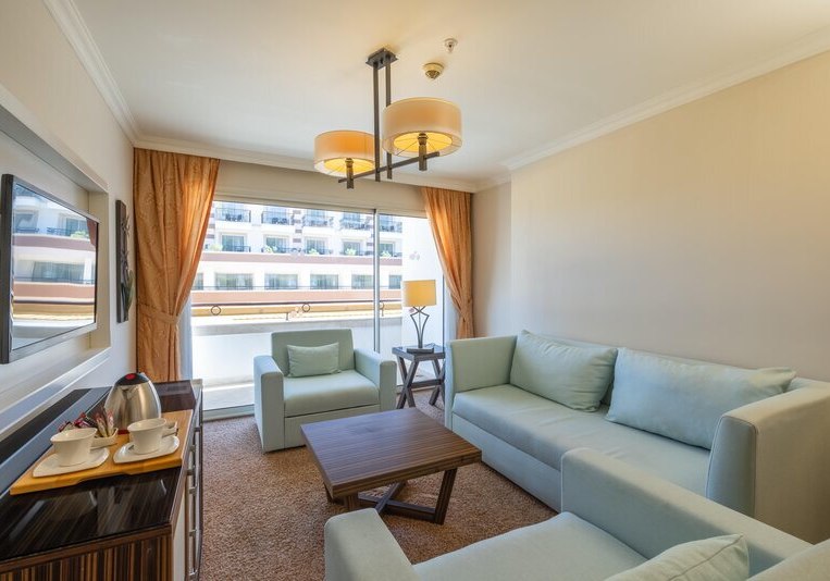• Klimaanlage • Balkon (je nach Zimmerkategorie) • Kühlschrank • Haartrockner • Minibar (kostenfrei) • Telefon • Safe (kostenfrei) • Meerblick (je nach Zimmerkategorie: seitlich) • Schlafsofa • Fernseher • rollstuhlgerechte Zimmer (auf Anfrage) • WiFi (kostenfrei) • Stadtblick • Gartenblick • Poolblick • Straßenblick • Schallisolation