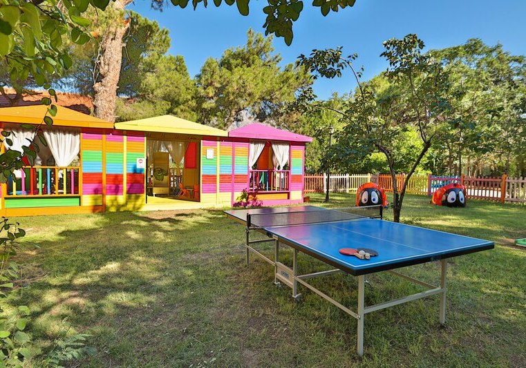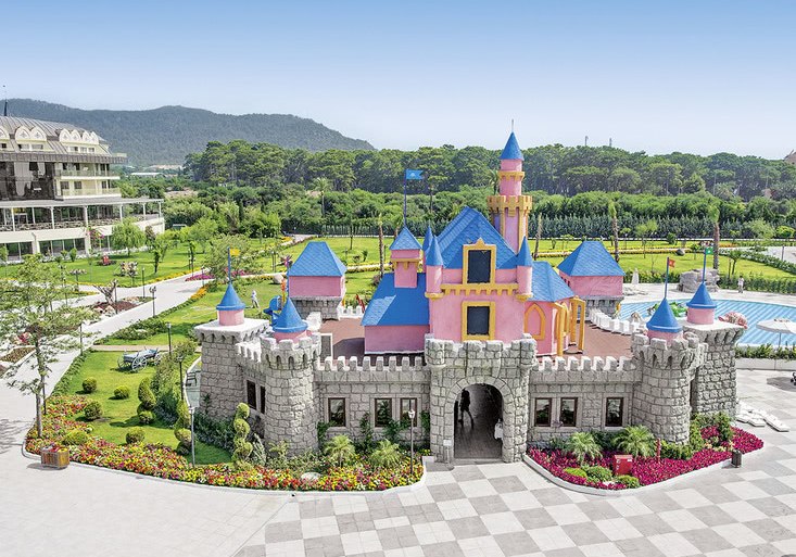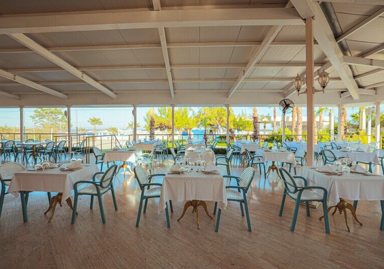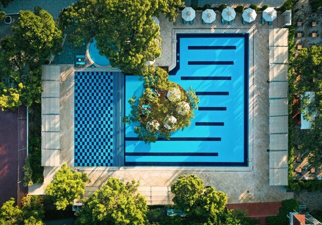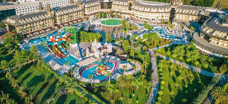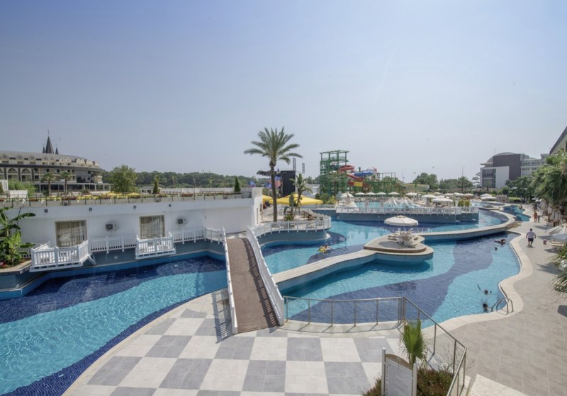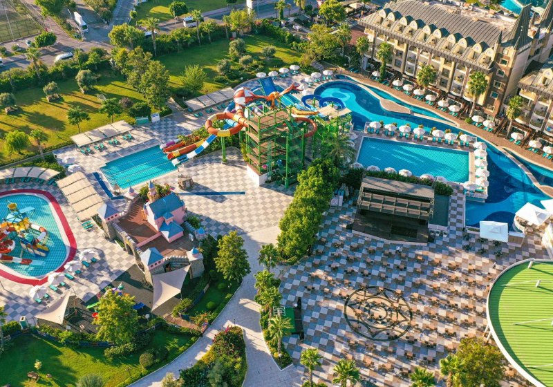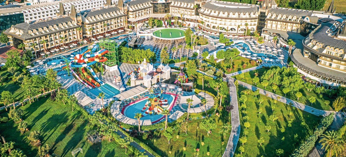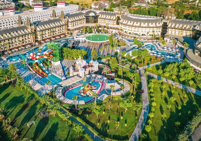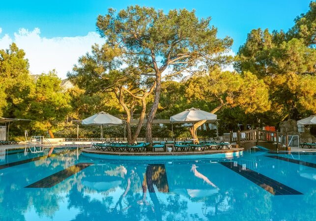 Willkommen in einem weitläufigen Resort, das Euch mit einer strukturierten Mischung aus Strandnähe, großzügigen Poolzonen und lebendigen Gemeinschaftsbereichen empfängt. Die Anlage verteilt sich auf mehrere dreistöckige Gebäudeblöcke und schafft kurze Wege zwischen Lobby, Restaurants, Pools und dem direkt gegenüberliegenden Sand-Kiesstrand, den Ihr über eine kleine Brücke erreicht. Familien, Aktivreisende und Ruhesuchende finden klar getrennte Bereiche für ihren Rhythmus in den Ferien.