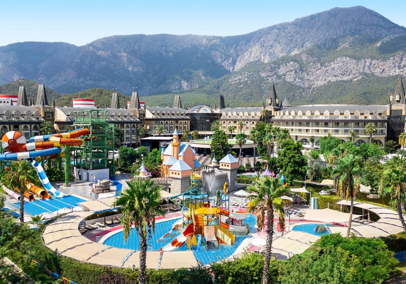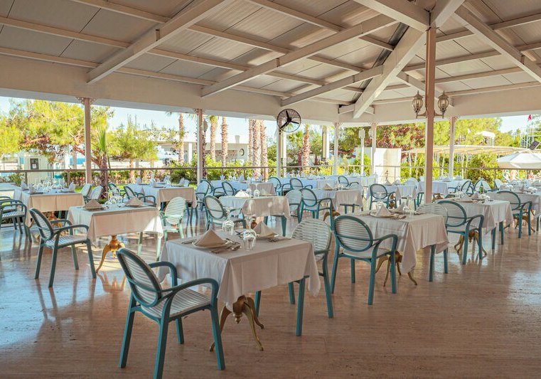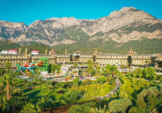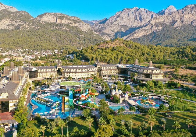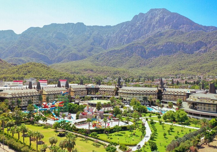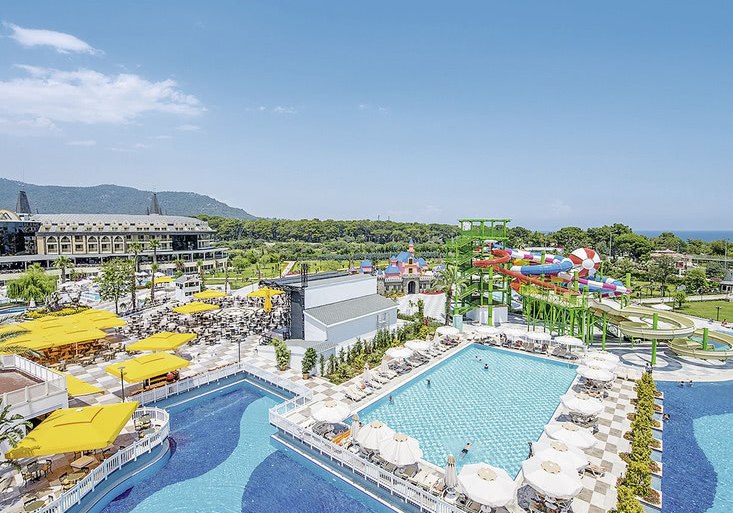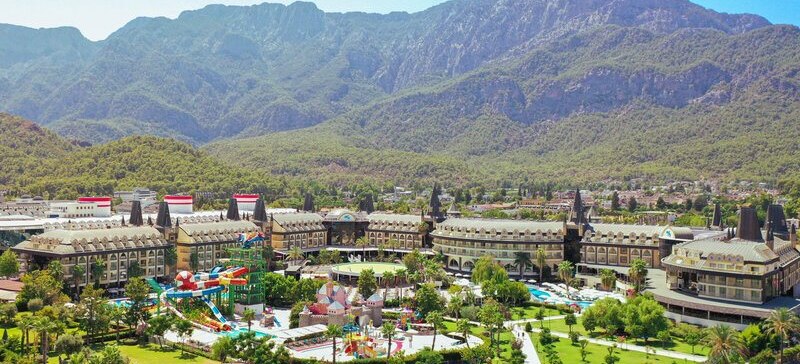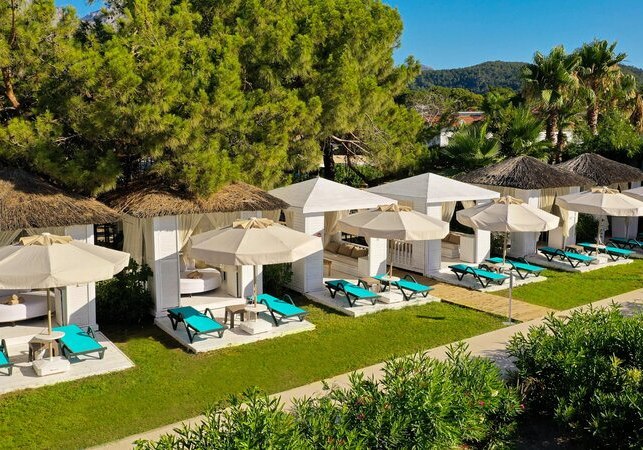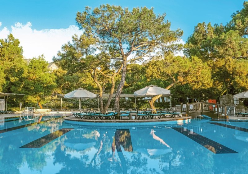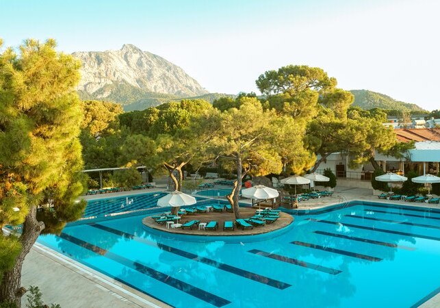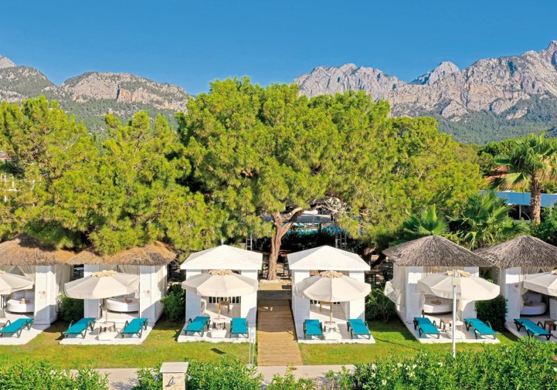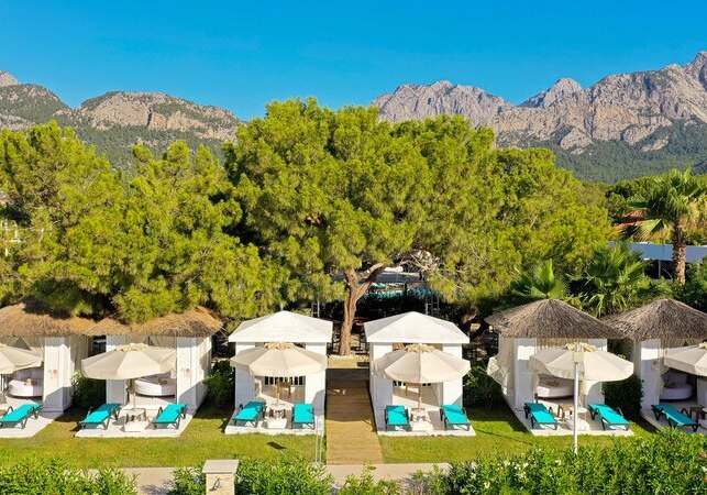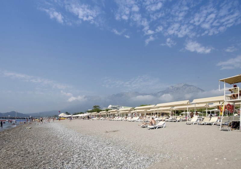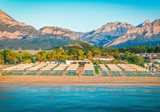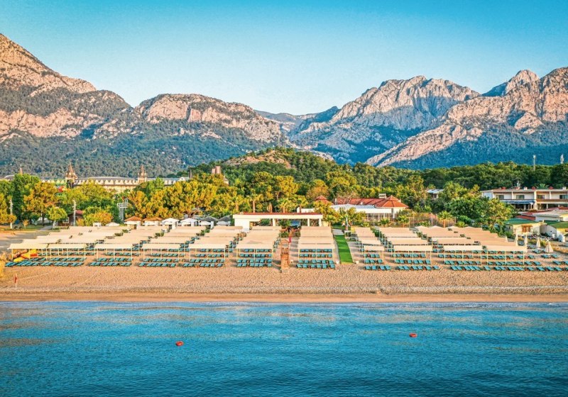 Das Resort liegt in Göynük bei Kemer, direkt am Sand-Kiesstrand, nur durch eine kleine Brücke getrennt. Bis ins Zentrum von Kemer sind es etwa 8 Kilometer, der Flughafen Antalya ist rund 40 Kilometer entfernt. Die Lage wirkt belebt, mit Strandbar und Strandpavillons als klaren Anlaufpunkten zwischen Wasser und Anlage in den Ferien.