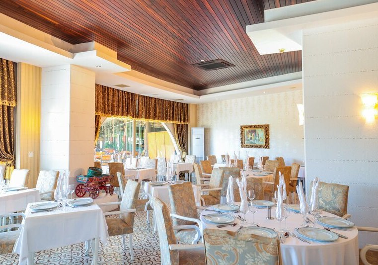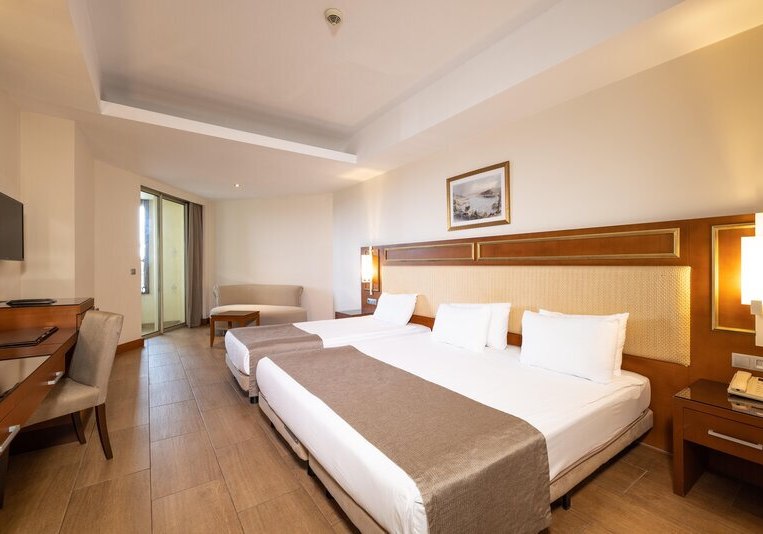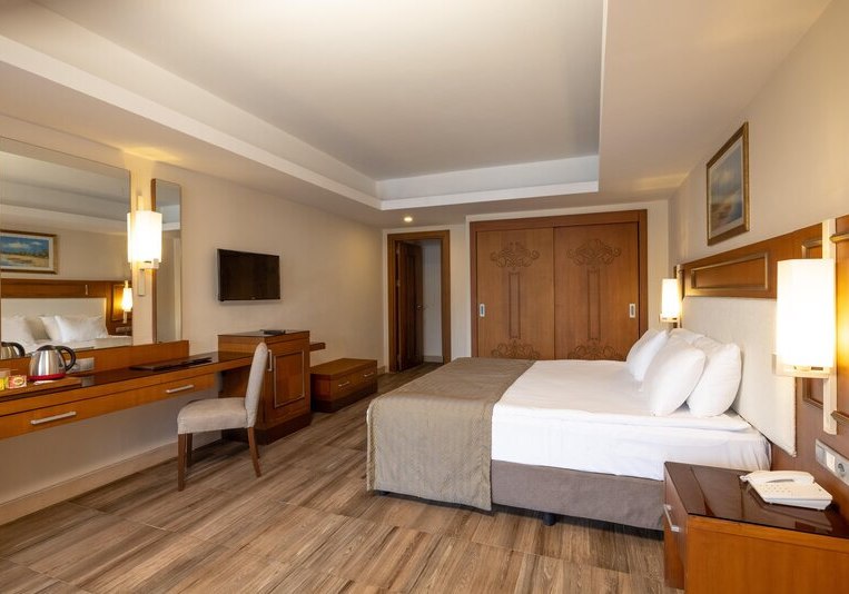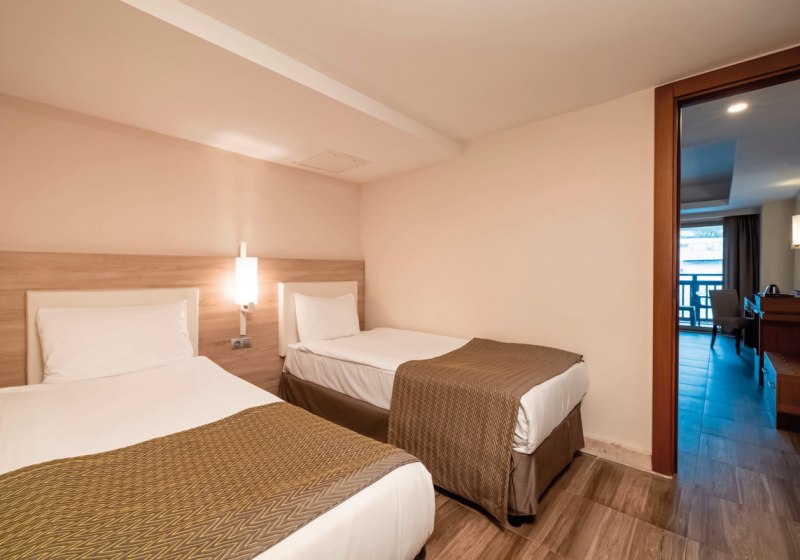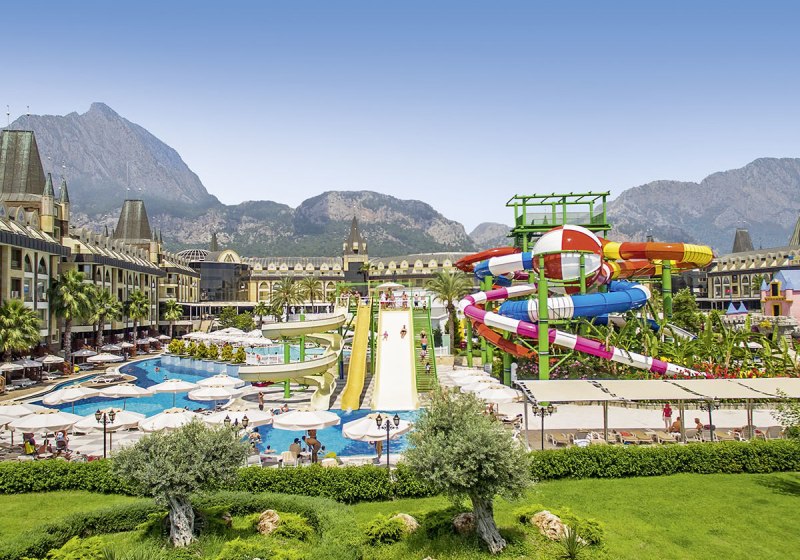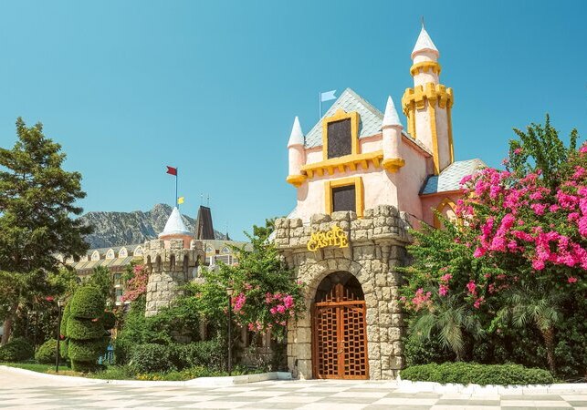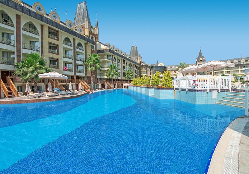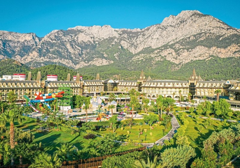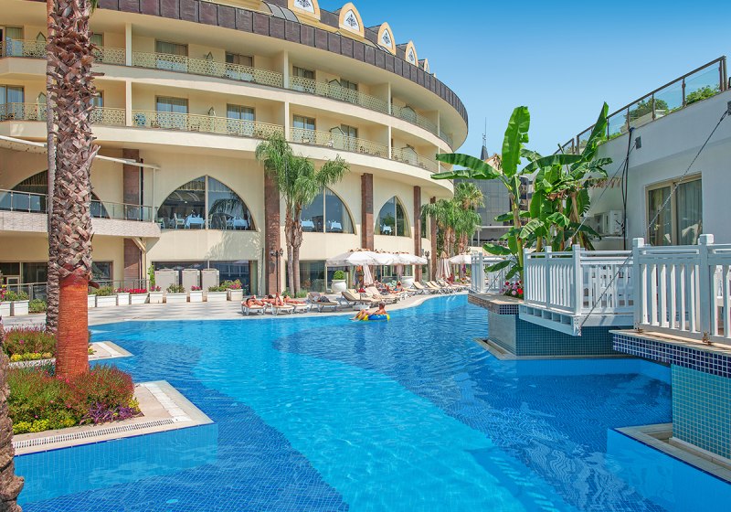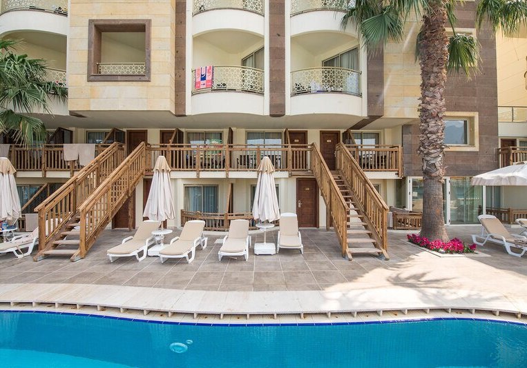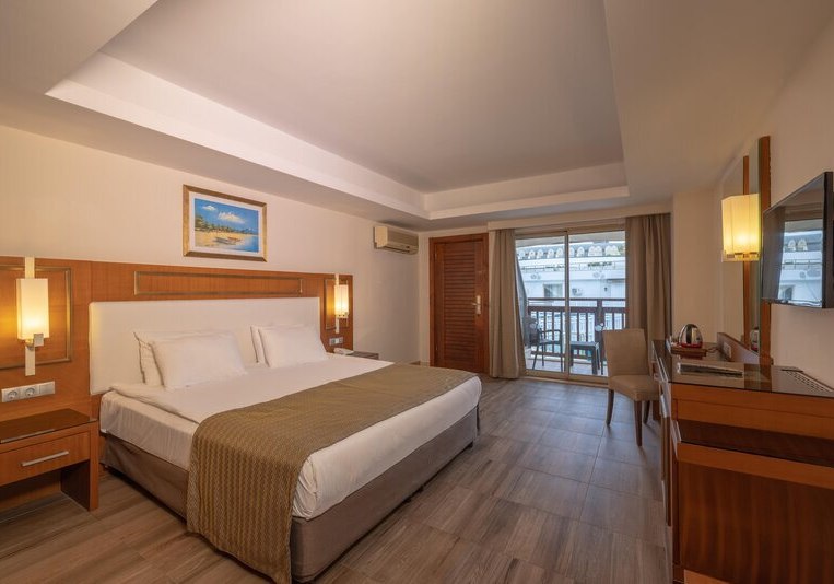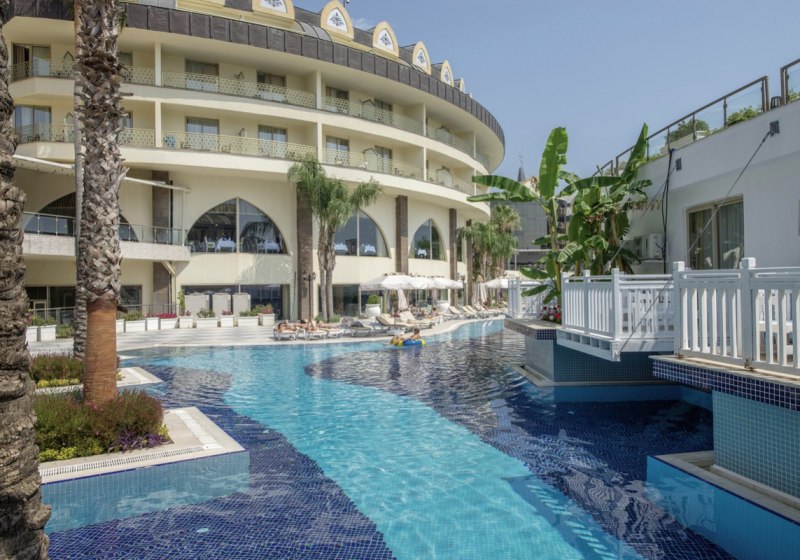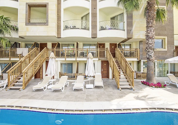 Das Resort liegt in Göynük bei Kemer, direkt am Sand-Kiesstrand, nur durch eine kleine Brücke getrennt. Bis ins Zentrum von Kemer sind es etwa 8 Kilometer, der Flughafen Antalya ist rund 40 Kilometer entfernt. Die Lage wirkt belebt, mit Strandbar und Strandpavillons als klaren Anlaufpunkten zwischen Wasser und Anlage in den Ferien.