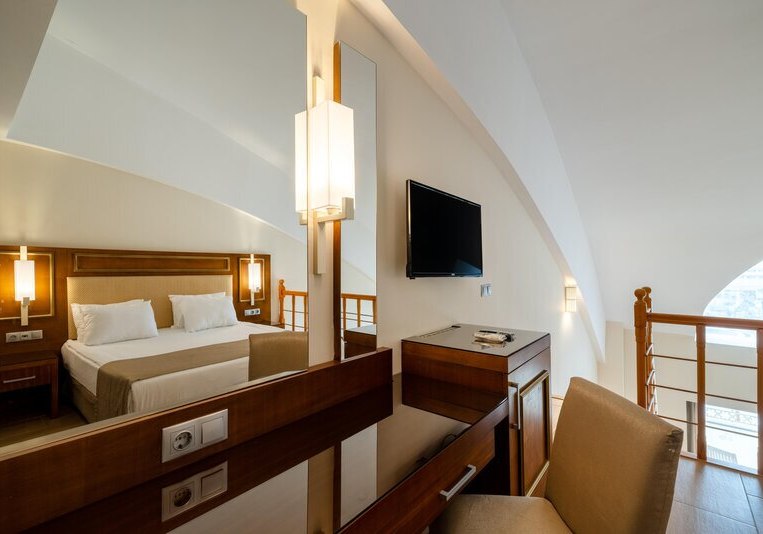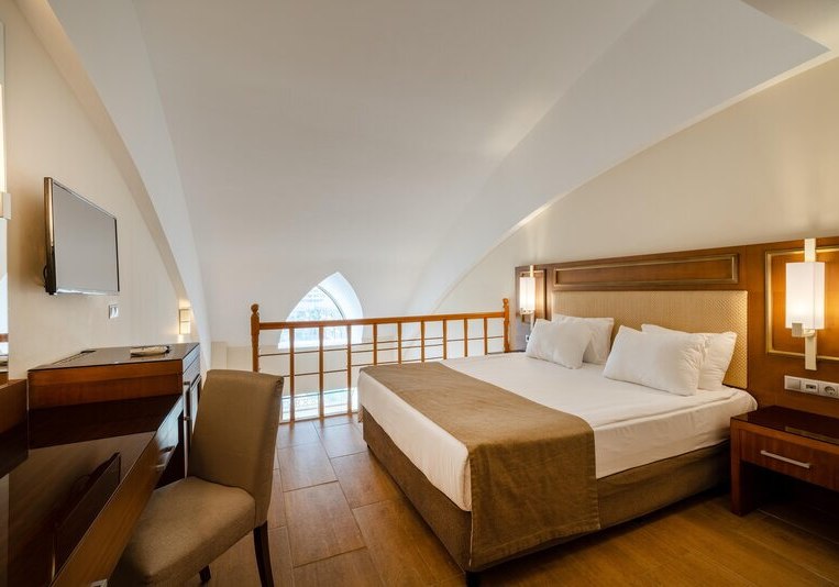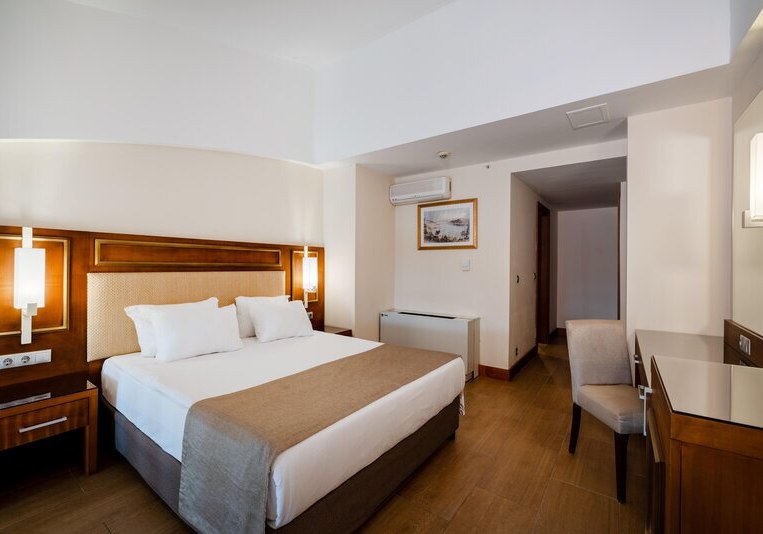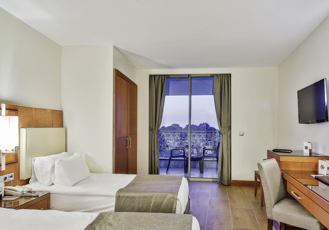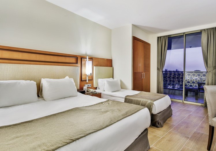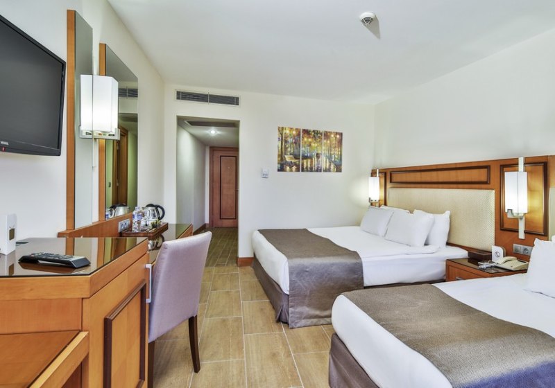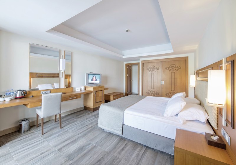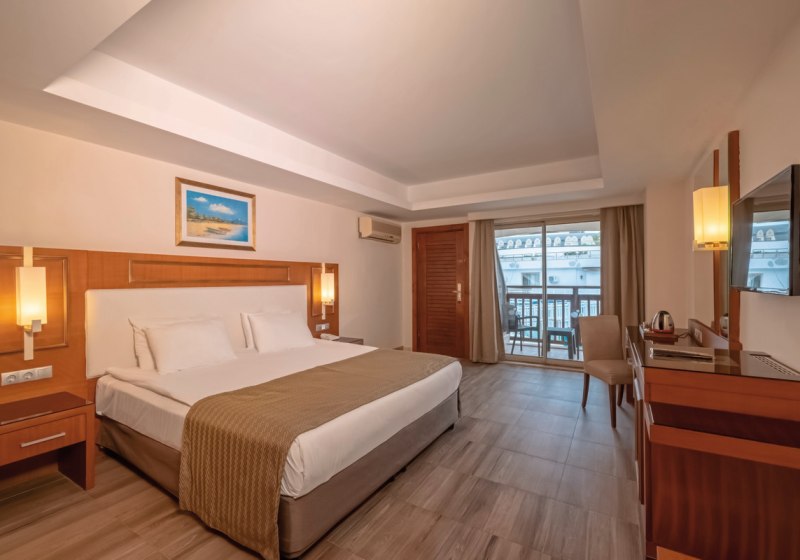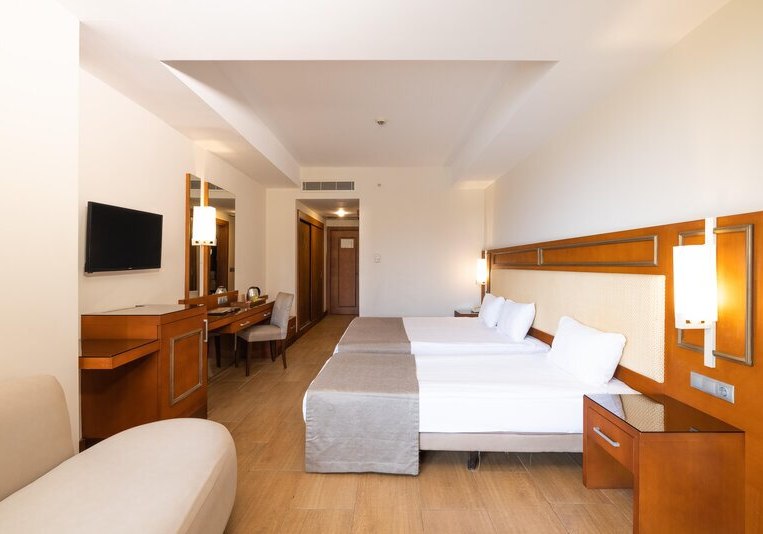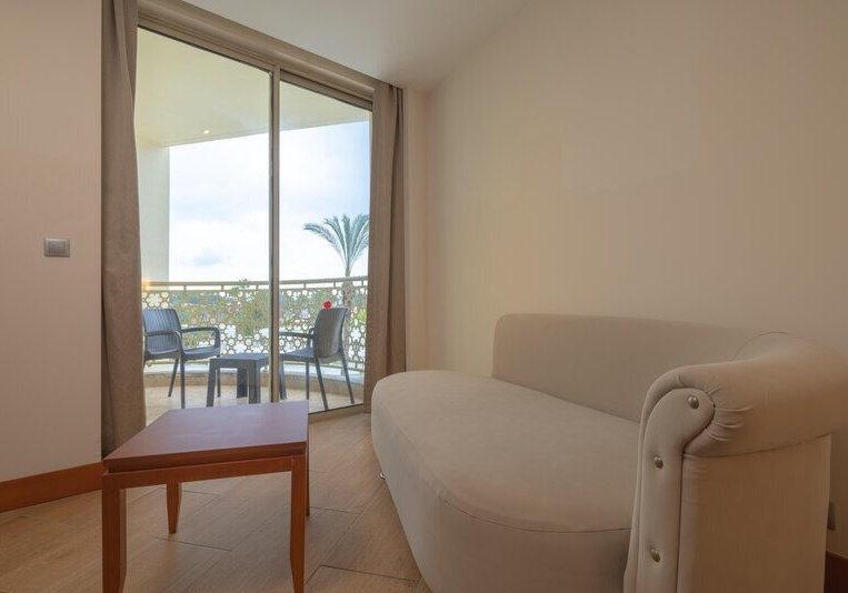 Die Zimmer sind funktional ausgestattet: Dusche/WC, Föhn, zentral gesteuerte Klimaanlage, Safe, Telefon, LCD-Sat-TV, Minibar sowie Kaffee-/Tee-Setup. Der Boden ist gefliest, viele Einheiten verfügen über Balkon oder Terrasse, teils französisch. Ausgewählte Zimmer bieten Meerblick, weitere blicken in Garten- oder Poolrichtung.